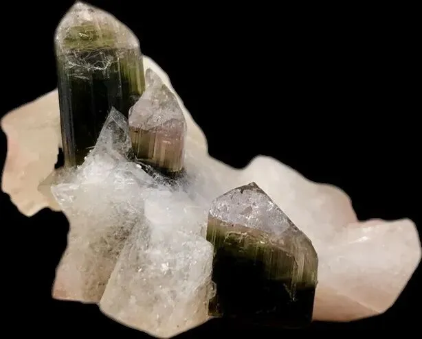 产地:可可托海3号矿脉、天山、昆仑山区伟晶岩。特征:三方晶系,颜色丰富(红、绿、蓝、双色西瓜碧玺),强多色性;硬度7–7.5;常与海蓝宝石、石榴石共生。