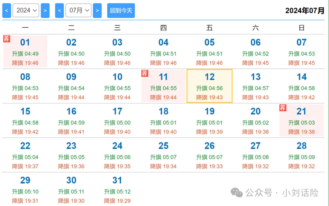 2024年7月升旗、降旗时间