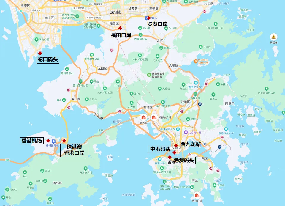 深圳→香港:陆路过关,罗湖口岸(6:30-24:00,通关后直达香港地铁罗湖站,可前往旺角、中环)、福田口岸(6:30-22:30,通关后直达落马洲站)、深圳湾口岸(6:30-24:00,可乘坐巴士直达尖沙咀、铜锣湾);水路过关:蛇口码头→香港上环码头(港澳码头),航程约50分钟,票价60元/人,1-6岁30元,适合想体验轮渡的游客。出上环码头即信德中心,D 口步行 5 分钟到上环港铁站。