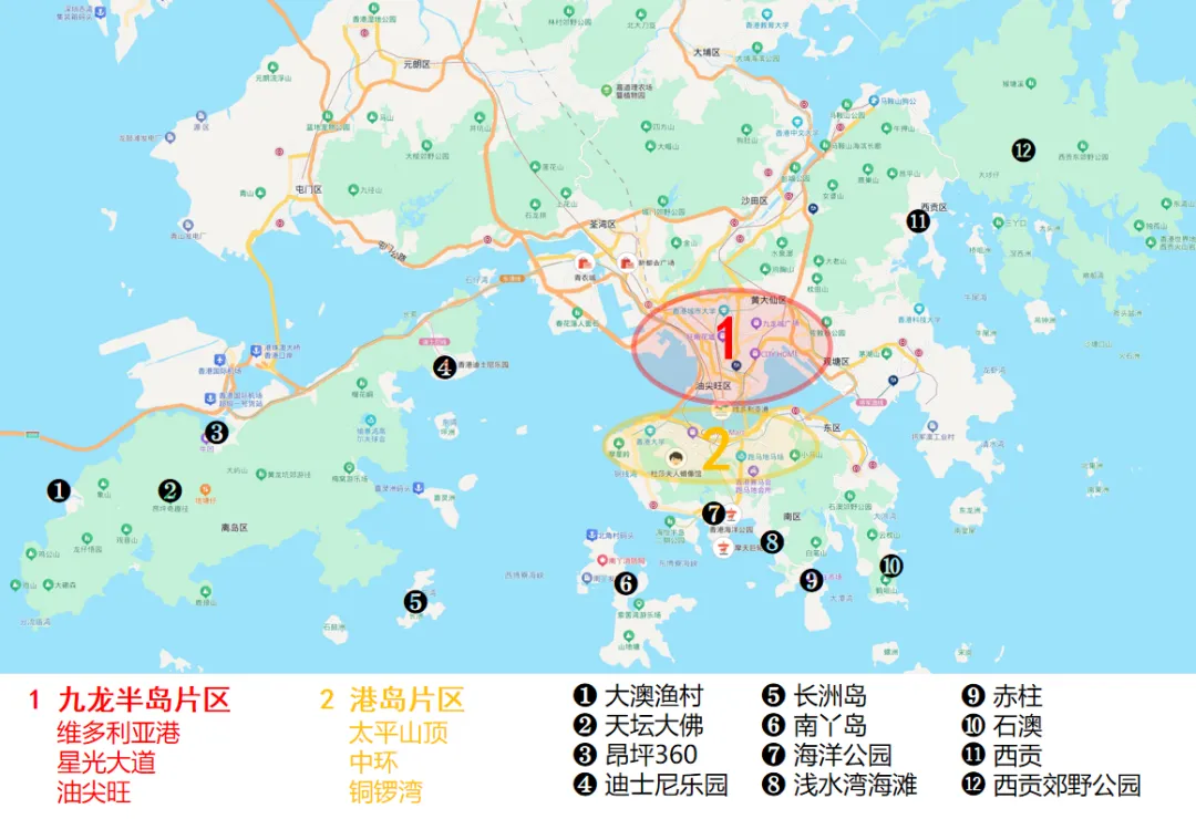 港岛:核心繁华区,汇聚中环、铜锣湾、湾仔等热门商圈,以及太平山顶、维多利亚港、海洋公园等经典地标