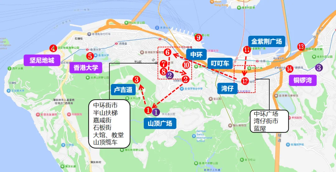 Day2:金紫荆广场、会展中心(湾仔地标,看维港海景) → 湾仔→ 乘坐叮叮车(体验百年电车,到中环)→ 中环街市(复古文创市集,港式小吃)→ 半山自动扶梯(世界最长户外扶梯,《重庆森林》取景地) → 嘉咸街涂鸦墙(网红壁画打卡)→ 石板街(砵典乍街,百年石板路,港风打卡)→ 大馆(历史警署建筑群,免费参观)→ 兰桂坊(知名酒吧街)、主教座堂 → 花园道缆车总站(乘坐百年缆车上山)→ 太平山顶 → 凌霄阁摩天台(黄昏日落 + 维港夜景,俯瞰全城)→ 卢吉道环山步道(平缓环山步道,沉浸式看夜景)→ 缆车/巴士下山 → 酒店