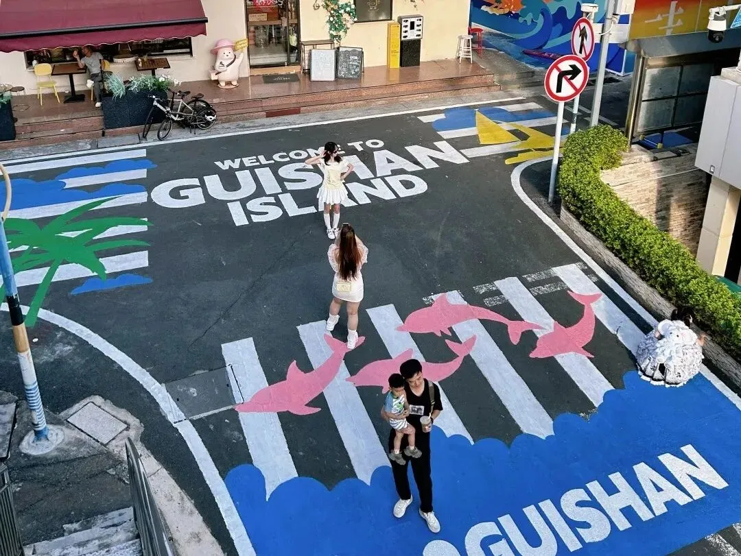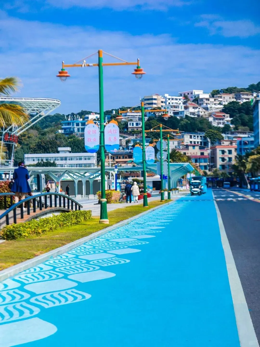 🔷 十字路口+网红斑马线:「桂小包」附近的十字路口,地面、墙体有可爱的彩绘,俯拍机位仿佛到了宫崎骏的漫画里,非常活泼可爱。向着游客服务中心的方向走,爱民路斜坡下,网红斑马线配大海,拍个背景照大片。
