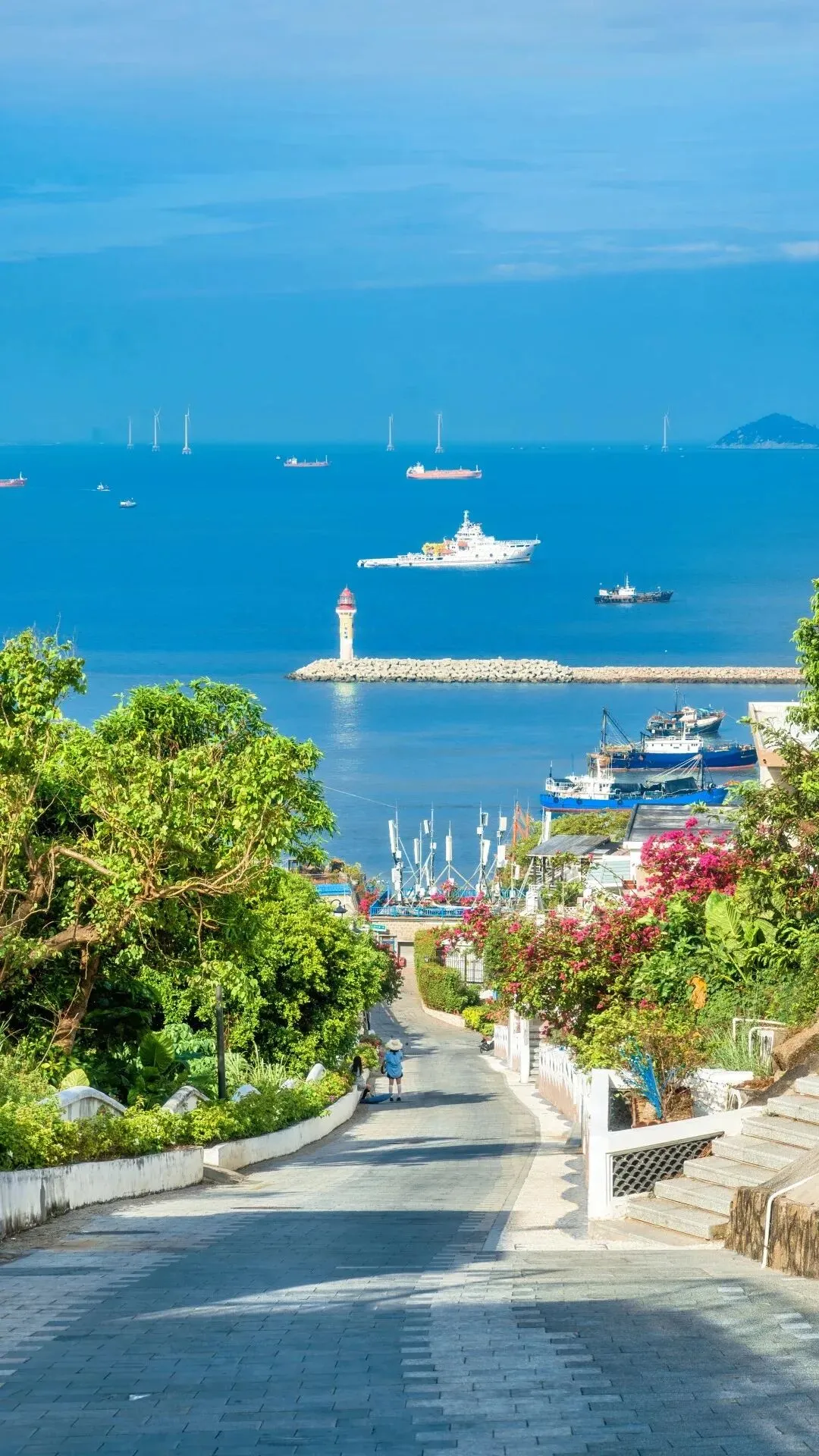🔷 爱民路+天空之境:沿着爱民路一路向上走,沿途三角梅开得灿烂,面朝大海,镜头拍人物背影和通向大海的坡道,漫画感满满。天空之境的打卡点很出片。