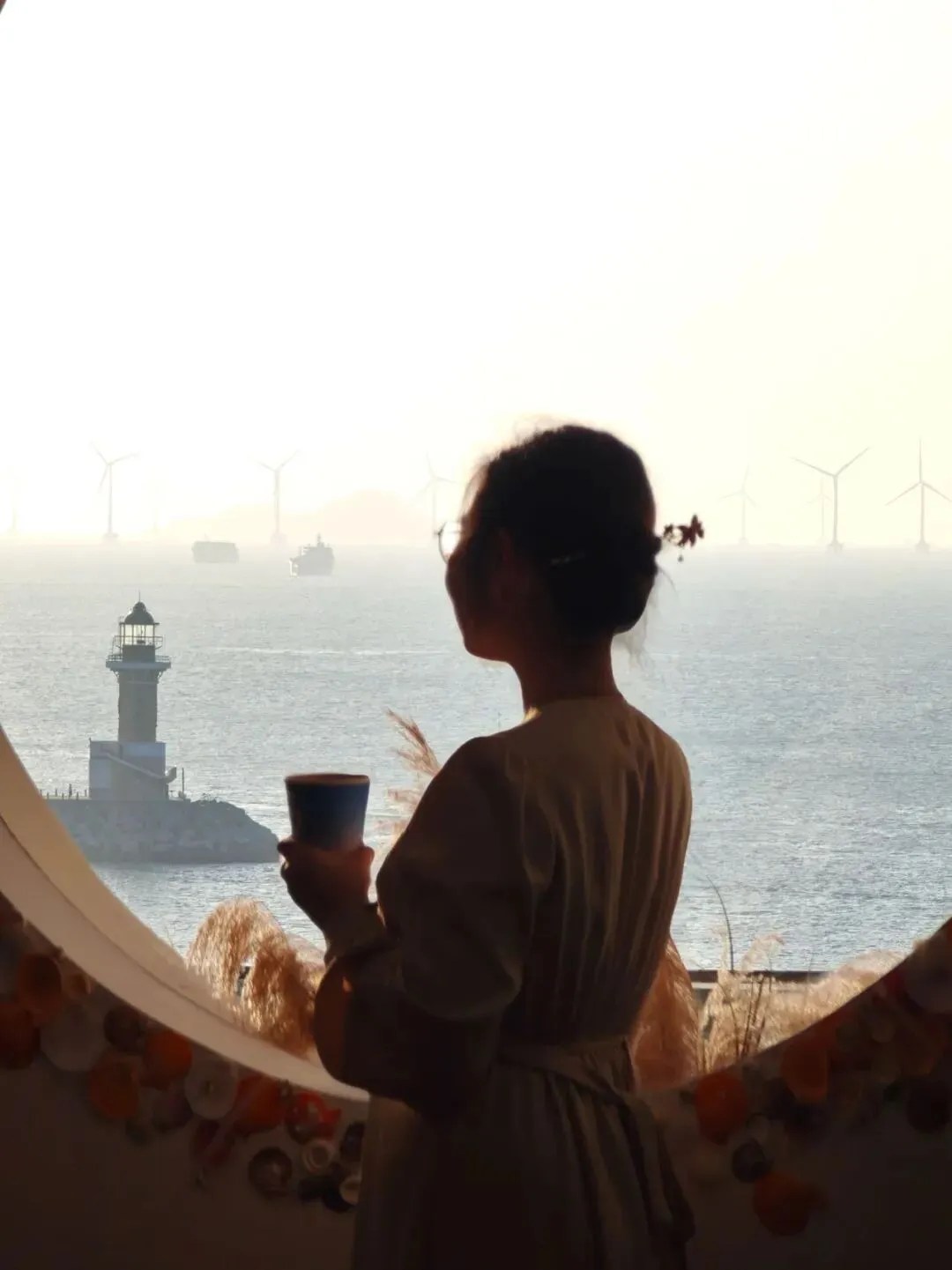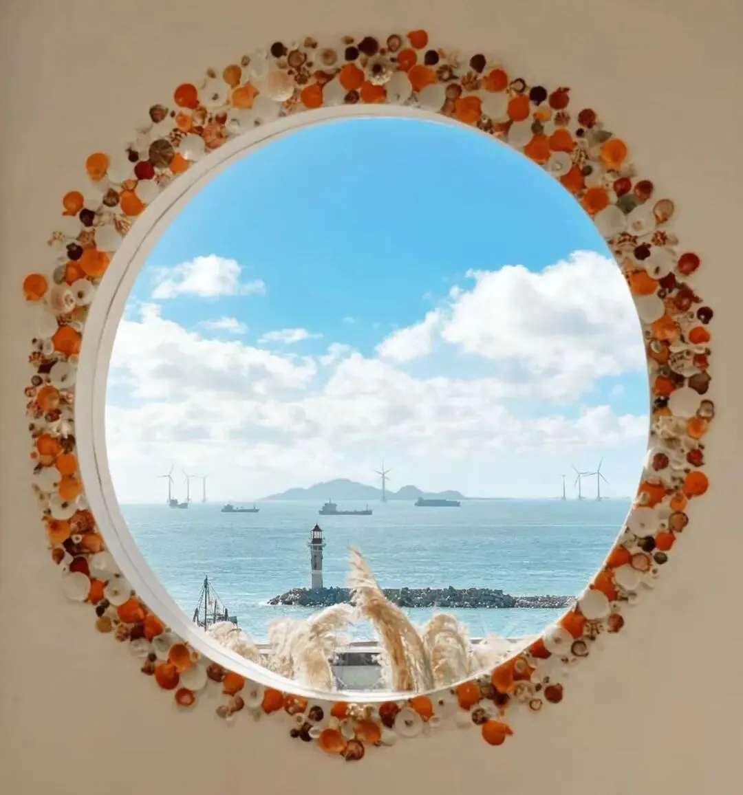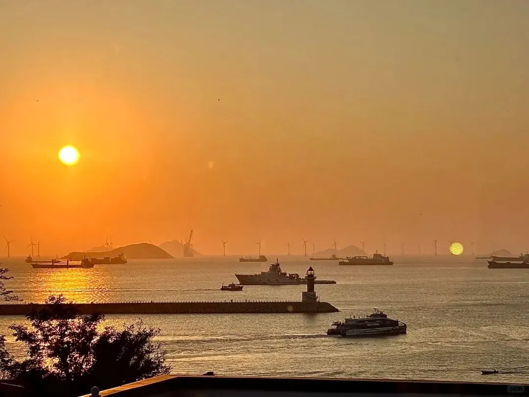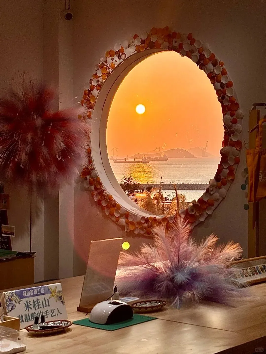 桂山非遗工坊和环岛公路也是海上日落、黄金晚霞的极佳观看点之一,建议3、4点的时间来,先店里逛逛,体验一项手工,待到5点~6点,在贝壳圆窗、蓝调时光走廊、二楼观海平台拍黄昏大片,不用滤镜直接出片!