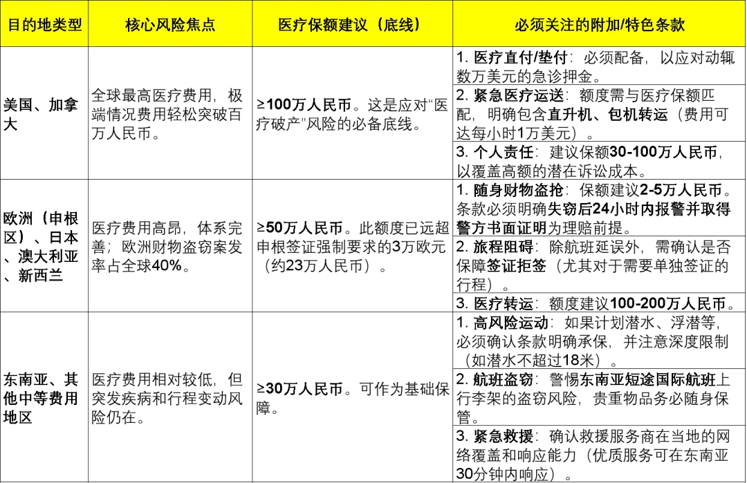选择产品时,首要原则是目的地医疗费用水平决定医疗保额底线,并匹配相应特色保障。