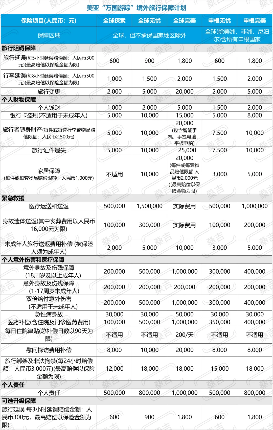 o不保地区:条款会明确列出不承保的国家和地区,通常包括处于战争、制裁或极高风险的国家,如阿富汗、叙利亚、伊朗、伊拉克、朝鲜等。行程目的地必须完全在保障区域内。