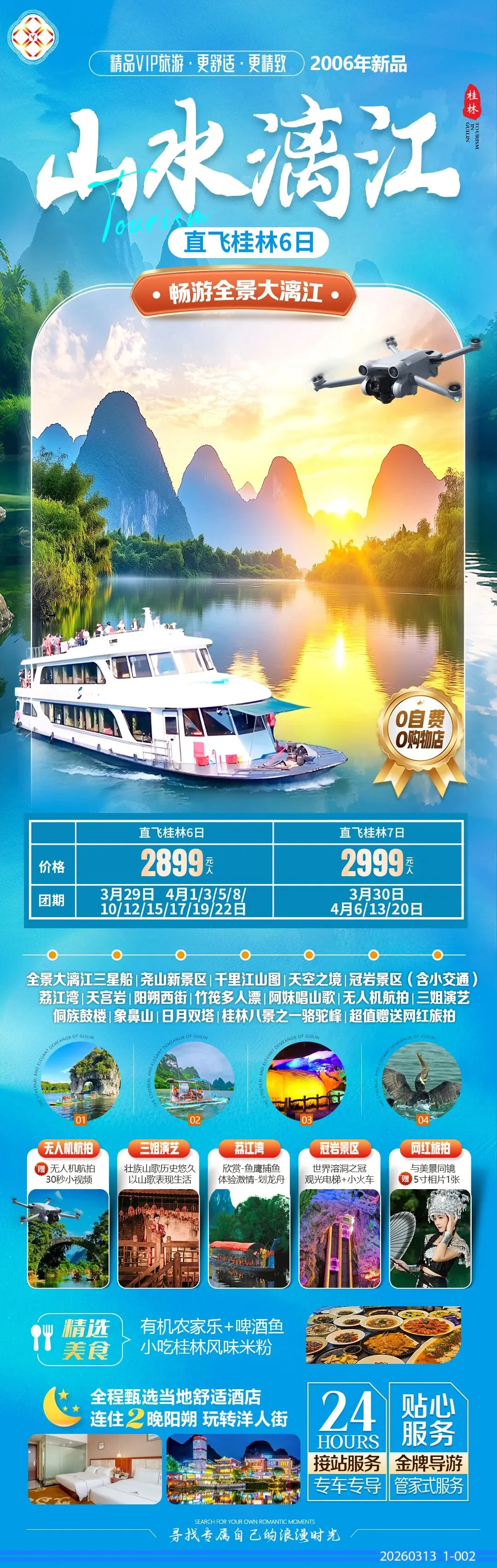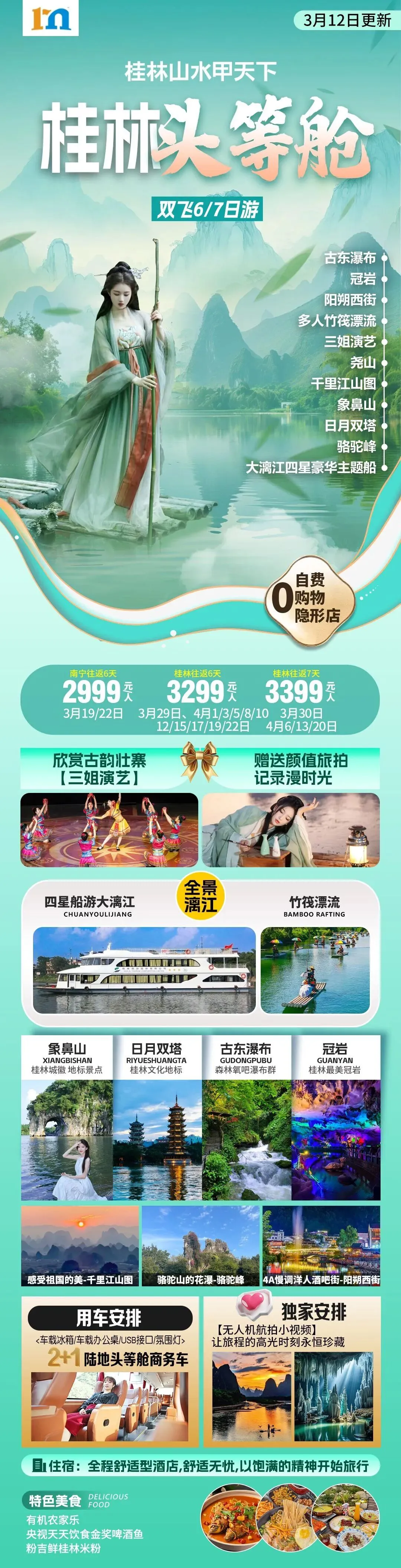 🏔️古东瀑布,冠岩,阳朔西街,遇龙河徒步,多人竹筏漂流,三姐演艺,大漓江四星豪华主题船,尧山,千里江山图,象鼻山,日月双塔,骆驼峰,