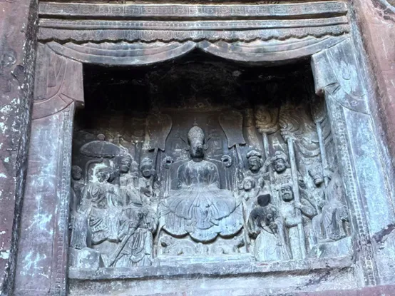 阁逻凤(第五代王):石钟寺第2窟规模最大,共16尊造像。王者头戴精雕王冠,坐于双狮龙头椅上,身后屏风雕日月飞龙。其弟阁陂和尚坐于右侧,身后撑曲柄伞,这正是吐蕃赐予南诏的仪仗,透露着南诏与吐蕃结盟的历史。