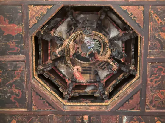 在巍宝山众多道观中,长春洞(国6)无意识最值得看的一座,始建于清乾隆四十四年(1779年),建成于清嘉庆年间(1796~1820年)。整座道观由山门、前殿、大殿、两厢和花园等建筑组成。正殿为主体建筑,重檐歇山顶(内有转阁),奉玉皇,两侧奉起、问二帝。室内藻井为八卦图,内雕蟠龙,四周天花板上满绘道教群仙夜宴图、三皇图、五老图等道教绘画。