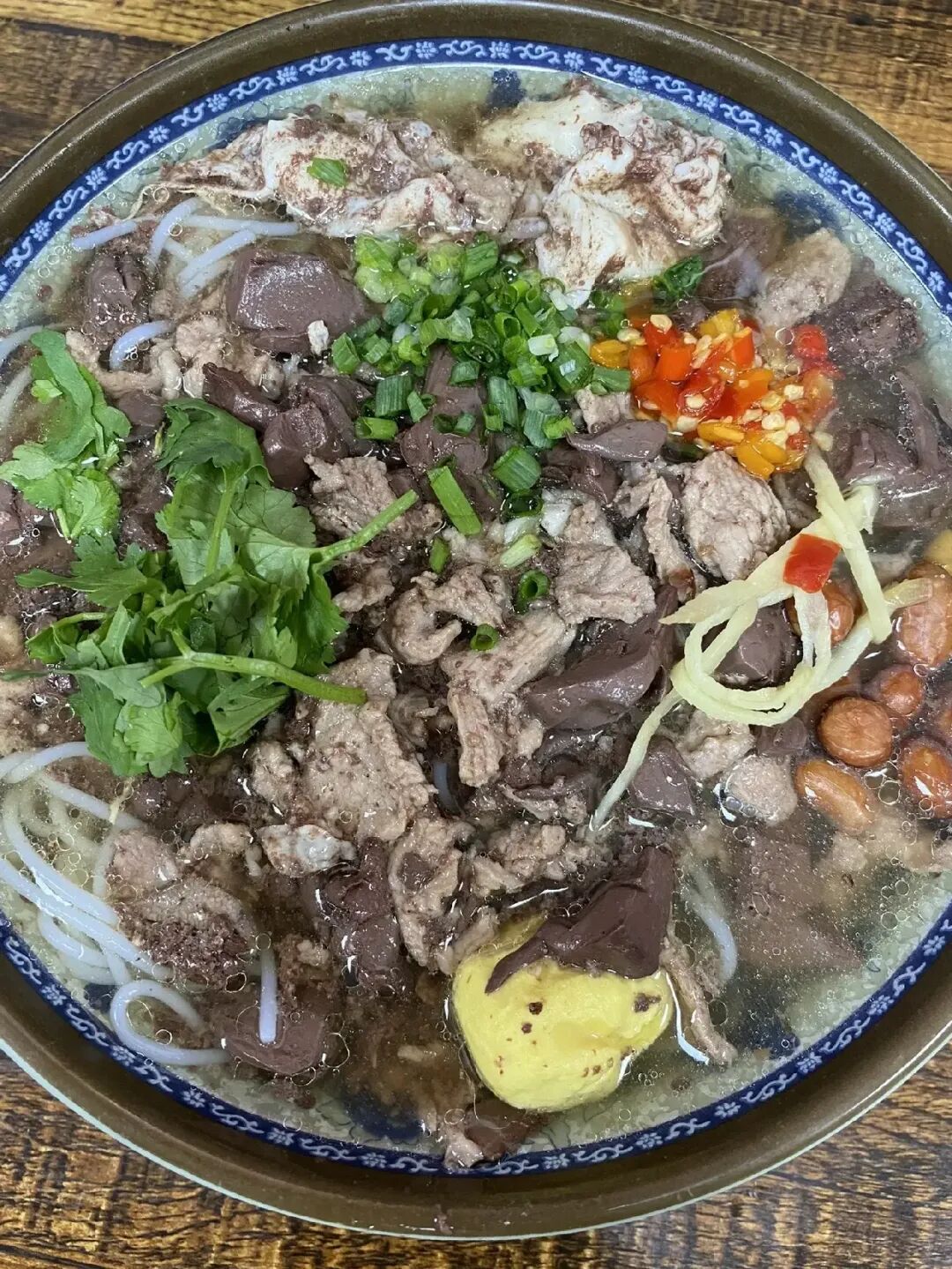 如果说鱼粉是郴州的名片,那杀猪粉就是北湖区的骄傲。其精髓在于一个"鲜"字。汤底是现熬的筒骨汤,清澈鲜美。码子是现杀的新鲜猪肉、猪肝、猪血等,烫熟后嫩滑无腥。 3. 东江鱼宴