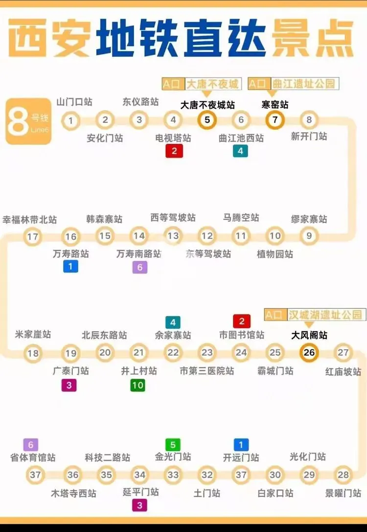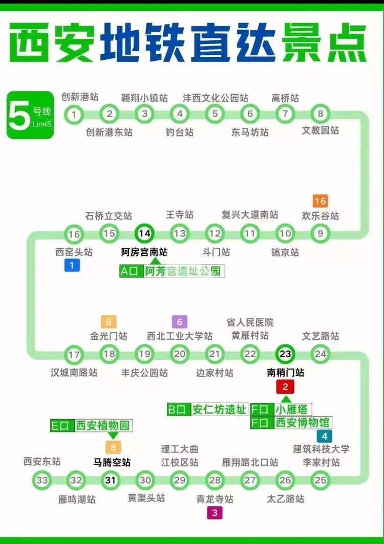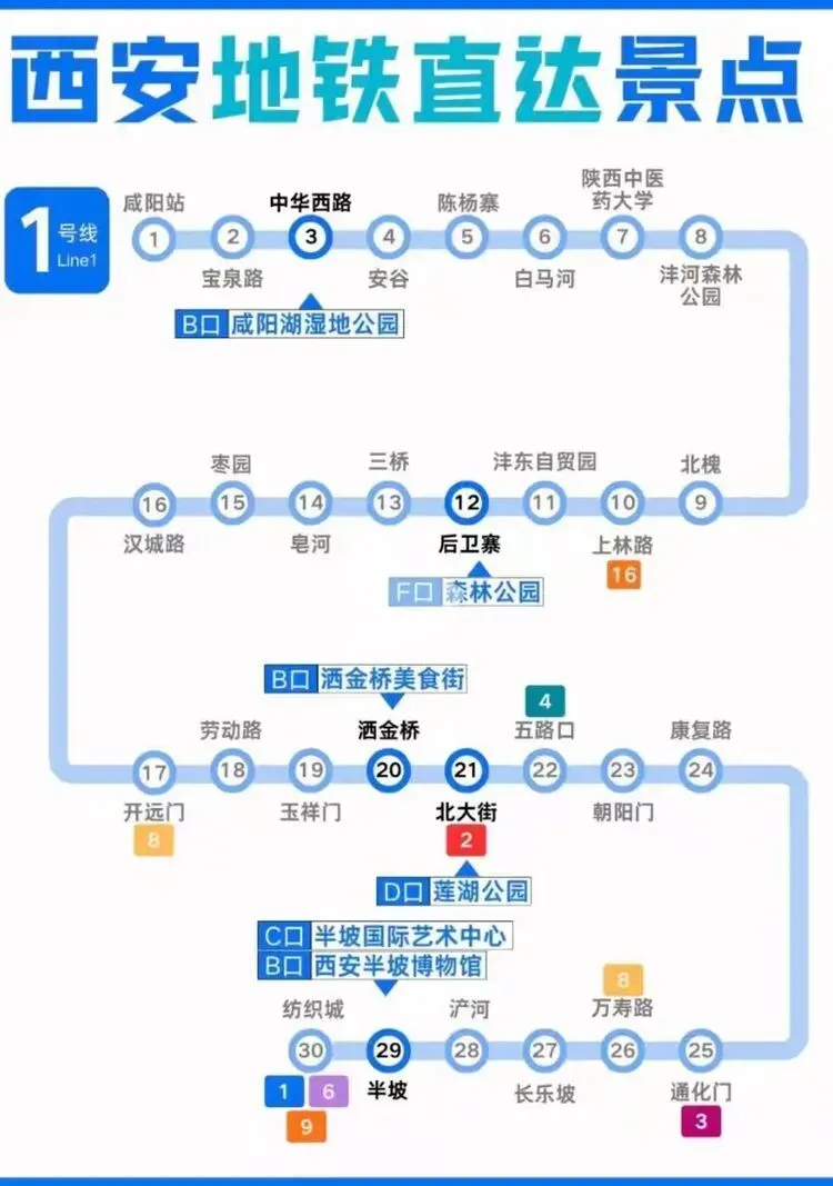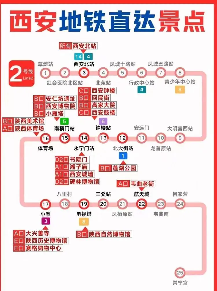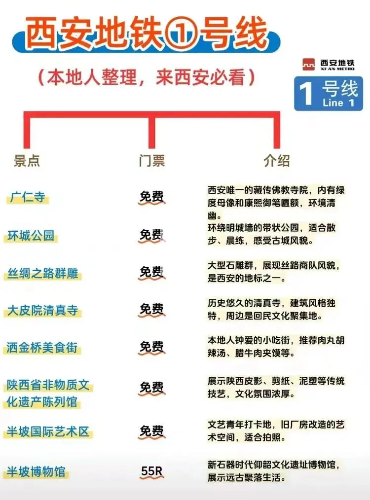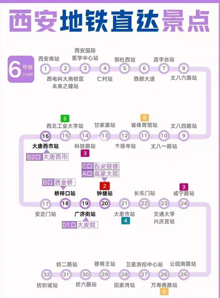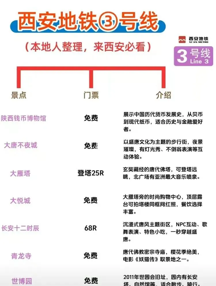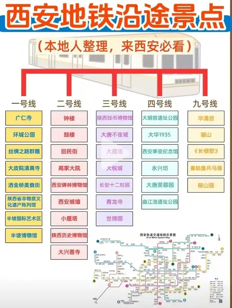 您现在的位置是:首页 > 国内旅游目的推荐 > 正文 国内旅游目的推荐 西安地铁沿线旅游景点实用攻略 admin2026年03月30日 11:20:35国内旅游目的推荐1 西安地铁沿线旅游景点实用攻略西安地铁沿线旅游景点实用攻略西安地铁网络覆盖广泛,是游客高效游览这座古都的理想选择。以下为各线路沿线景点信息,帮助你轻松规划行程。地铁1号线1号线串联起城西与城东,途经多个历史与现代交融的景点。从洒金桥站出发,可品尝地道西安美食;玉祥门站附近有明代城墙遗址,适合感受古城风貌;半坡站则能探访半坡遗址,了解新石器时代文化。地铁2号线作为南北向主干线,2号线直达多个核心景点。钟楼站出来就是西安的地标钟楼和鼓楼,登楼可俯瞰城市中轴线;永宁门站紧邻明城墙南门,是体验城墙骑行的热门起点;小寨站周边商业繁华,也是前往陕西历史博物馆的便捷选择。地铁3号线3号线以“科技与自然”为特色,沿途景点丰富。大雁塔站直达大雁塔北广场,夜晚的音乐喷泉值得一看;香湖湾站可前往西安世博园,感受园林与现代建筑的结合;保税区站附近的砂之船奥莱适合购物休闲。地铁4号线4号线连接了西安北站与航天城,途经多个文化景点。大唐芙蓉园站紧邻同名景区,可体验唐代皇家园林的恢弘;大雁塔站与3号线换乘,方便游览大雁塔及周边;市图书馆站附近有城市运动公园,适合休闲散步。地铁5号线5号线串联起西咸新区与城东,景点以自然与历史结合为主。阿房宫南站可探访阿房宫遗址,感受秦代建筑的遗迹;马腾空站附近有雁鸣湖休闲公园,适合放松观景;文艺路站周边文化氛围浓厚,可体验本地生活。地铁6号线6号线覆盖城南高校与文化区域,适合感受年轻活力与历史底蕴。西北工业大学站周边高校林立,学术氛围浓厚;大唐西市站可参观大唐西市博物馆,了解丝绸之路的商贸历史;木塔寺站附近有木塔寺遗址公园,环境清幽。地铁8号线8号线为环线,串联起多个换乘站,方便游客换乘其他线路游览全城。沿线经过多个商圈和公园,如土门站的土门商圈、雁南公园站的雁南公园等,适合根据行程灵活安排。地铁9号线9号线连接西安市区与临潼区,是前往兵马俑和华清池的便捷选择。华清池站直达华清池景区,可欣赏温泉和唐代皇家园林;兵马俑站出来即到秦始皇陵兵马俑,感受世界奇迹的震撼。出行小贴士- 建议使用西安地铁APP或支付宝/微信乘车码,方便快捷。- 部分景点门票可提前在线预约,尤其是陕西历史博物馆等热门景点。- 地铁末班车时间一般在23点左右,合理安排行程避免错过末班车。 转载请说明来源于"旅荐网",部分内容转载自网络,如有侵权请联系qlwl@foxmail.com删除 本文地址:https://www.15386.cn/post/150585.html 上一篇 真全!国内自驾游最美线路,旅游博主7年制100+地图! 下一篇 2000元大奖速抢 王母山桃花节+庙会游玩全攻略,仙山粉黛逛不停 相关文章 #大理3天2夜旅游攻略️不绕路行程+美食! 2000元大奖速抢 王母山桃花节+庙会游玩全攻略,仙山粉黛逛不停 【出行攻略】视频号同款线路,直接找旅游定制师媛媛! 一个人重庆旅行!AI做的双版攻略直接封神 威海旅行指南:刘公岛、那香海、鸡鸣岛全攻略 旅行指南|假期旅行|旅行攻略|出行 - 拷贝 呼和浩特5月旅游全攻略:草原初绿,避开人潮的完美时节 收好!3-5月出游指南!8个小众春游地避开人山人海,收下小众春游地图,独享春光! 如何用AI做旅行攻略,30分钟搞定别人3天的功课 厦门旅行攻略,逛吃看海全攻略 发表评论 取消回复 评论列表 这篇文章还没有收到评论,赶紧来抢沙发吧~