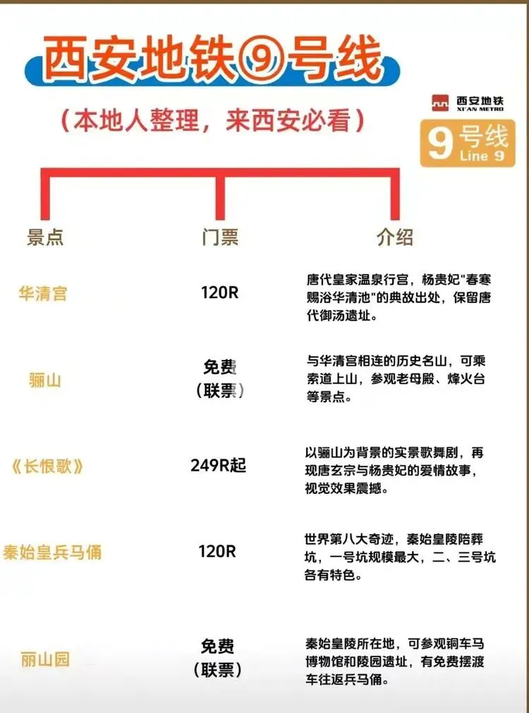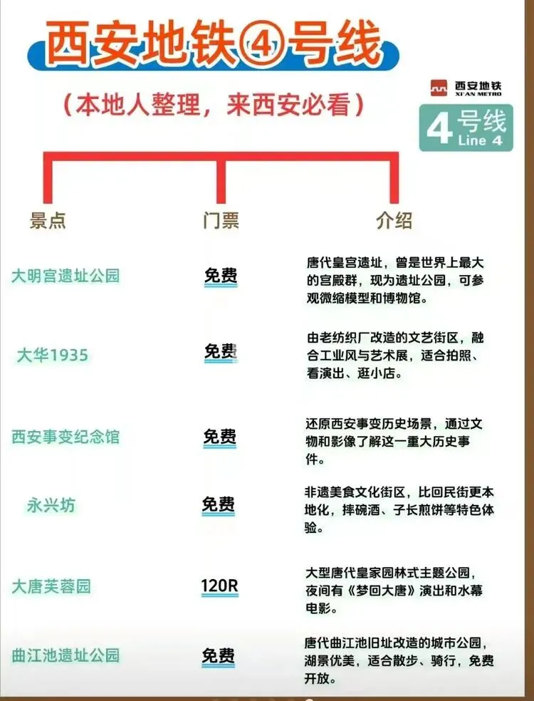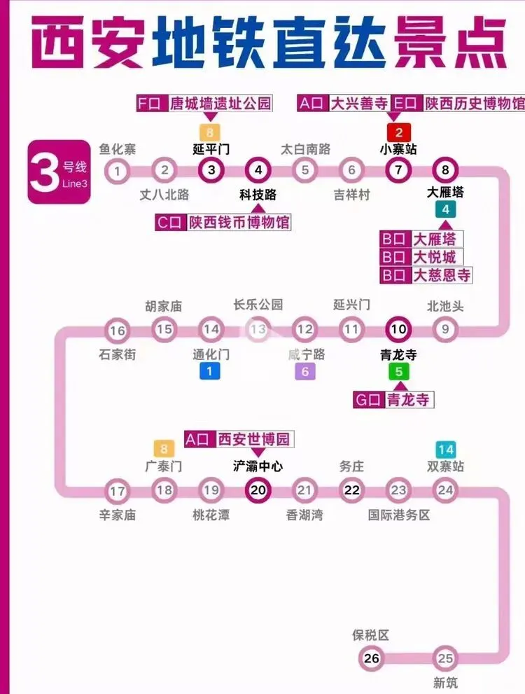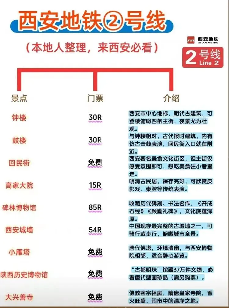 您现在的位置是:首页 > 旅游攻略 > 正文 旅游攻略 西安地铁沿线旅游景点实用攻略 admin2026年03月30日 11:21:41旅游攻略1 西安地铁沿线旅游景点实用攻略西安地铁沿线旅游景点实用攻略西安地铁网络覆盖广泛,是游客高效游览这座古都的理想选择。以下为各线路沿线景点信息,帮助你轻松规划行程。地铁1号线1号线串联起城西与城东,途经多个历史与现代交融的景点。从洒金桥站出发,可品尝地道西安美食;玉祥门站附近有明代城墙遗址,适合感受古城风貌;半坡站则能探访半坡遗址,了解新石器时代文化。地铁2号线作为南北向主干线,2号线直达多个核心景点。钟楼站出来就是西安的地标钟楼和鼓楼,登楼可俯瞰城市中轴线;永宁门站紧邻明城墙南门,是体验城墙骑行的热门起点;小寨站周边商业繁华,也是前往陕西历史博物馆的便捷选择。地铁3号线3号线以“科技与自然”为特色,沿途景点丰富。大雁塔站直达大雁塔北广场,夜晚的音乐喷泉值得一看;香湖湾站可前往西安世博园,感受园林与现代建筑的结合;保税区站附近的砂之船奥莱适合购物休闲。地铁4号线4号线连接了西安北站与航天城,途经多个文化景点。大唐芙蓉园站紧邻同名景区,可体验唐代皇家园林的恢弘;大雁塔站与3号线换乘,方便游览大雁塔及周边;市图书馆站附近有城市运动公园,适合休闲散步。地铁5号线5号线串联起西咸新区与城东,景点以自然与历史结合为主。阿房宫南站可探访阿房宫遗址,感受秦代建筑的遗迹;马腾空站附近有雁鸣湖休闲公园,适合放松观景;文艺路站周边文化氛围浓厚,可体验本地生活。地铁6号线6号线覆盖城南高校与文化区域,适合感受年轻活力与历史底蕴。西北工业大学站周边高校林立,学术氛围浓厚;大唐西市站可参观大唐西市博物馆,了解丝绸之路的商贸历史;木塔寺站附近有木塔寺遗址公园,环境清幽。地铁8号线8号线为环线,串联起多个换乘站,方便游客换乘其他线路游览全城。沿线经过多个商圈和公园,如土门站的土门商圈、雁南公园站的雁南公园等,适合根据行程灵活安排。地铁9号线9号线连接西安市区与临潼区,是前往兵马俑和华清池的便捷选择。华清池站直达华清池景区,可欣赏温泉和唐代皇家园林;兵马俑站出来即到秦始皇陵兵马俑,感受世界奇迹的震撼。出行小贴士- 建议使用西安地铁APP或支付宝/微信乘车码,方便快捷。- 部分景点门票可提前在线预约,尤其是陕西历史博物馆等热门景点。- 地铁末班车时间一般在23点左右,合理安排行程避免错过末班车。 转载请说明来源于"旅荐网",部分内容转载自网络,如有侵权请联系qlwl@foxmail.com删除 本文地址:https://www.15386.cn/post/150588.html 上一篇 #大理3天2夜旅游攻略️不绕路行程+美食! 相关文章 真全!国内自驾游最美线路,旅游博主7年制100+地图! 凡人看到全宇宙的方法,不是旅游探索 日本|必收藏,鎌倉一日旅游特種兵攻略「景点·路线·打卡」 川西旅游全攻略|人间净土,雪山、草原、海子与信仰的极致之旅! 呼和浩特5月旅游全攻略:草原初绿,避开人潮的完美时节 肇庆最全景点游玩攻略 公司要换老板了,我却在做五一旅游攻略 小长假当然就去江西啦\四天三晚旅游攻略 江西五日游玩攻略,人均800+性价比直接拉满 重庆旅游攻略理工男男友手绘地图太牛了! 发表评论 取消回复 评论列表 这篇文章还没有收到评论,赶紧来抢沙发吧~