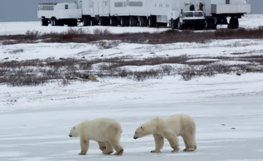 丘吉尔观熊方式:1)乘坐特制的北极熊观光车(Polar Rover),在安全的距离观察北极熊 2)10-11月是北极熊聚集等待哈德逊湾结冰的高峰期,可见到数十只北极熊 3)这是陆基活动,无需乘船