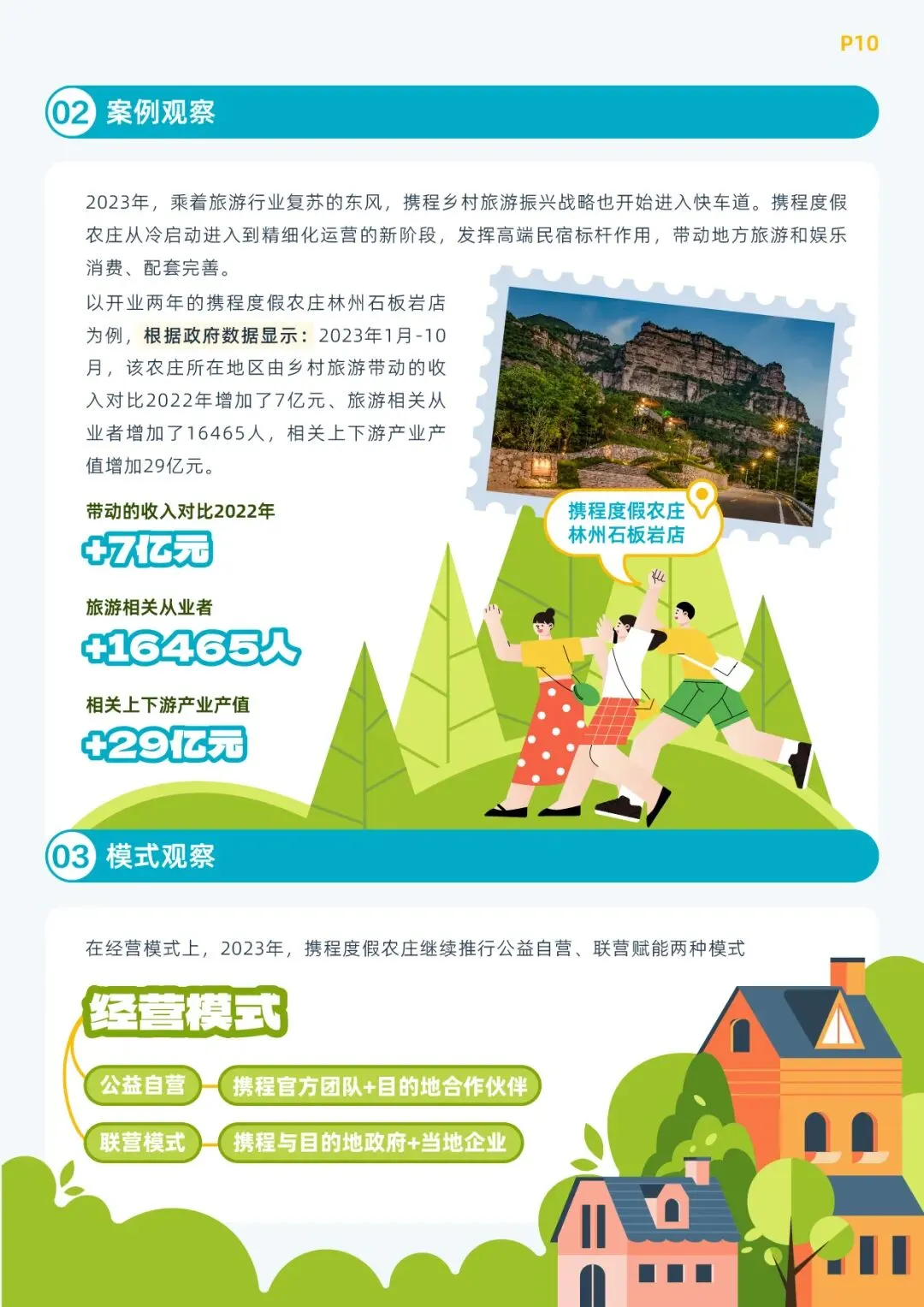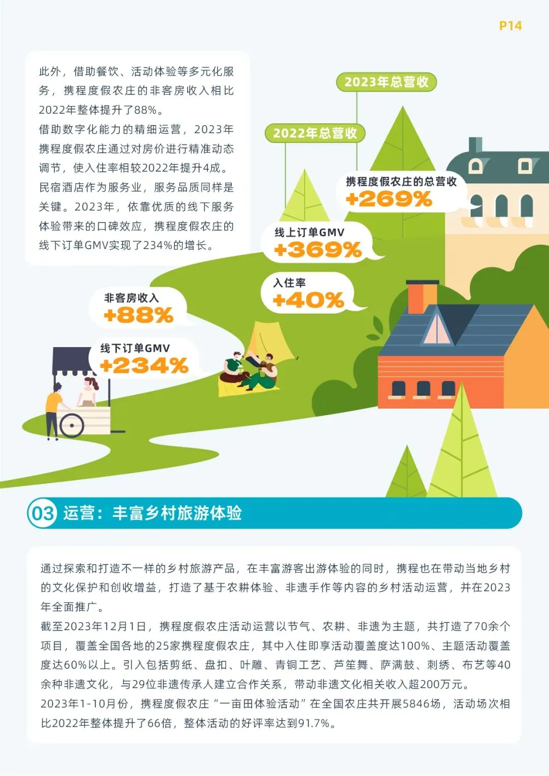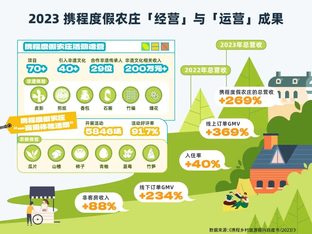 首先在“经营带动”层面,在冷启动和爬坡期过后,2023年携程度假农庄总营收相较2022年实现269%的增长,其中,线上订单GMV增长达到369%。其次,在“运营带动”层面,2023年携程农庄以各地节气、农耕、非遗为主题,打造70余个乡村体验项目,在全国农庄共开展5846场活动,整体活动好评率达到91.7%,带动各个村庄及非遗文化相关收入超200万元。