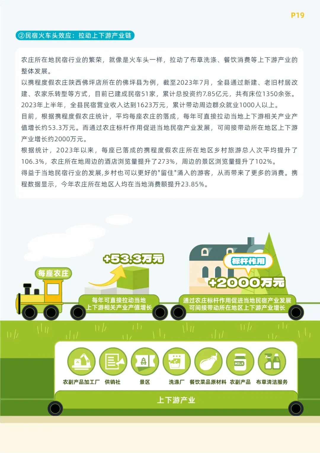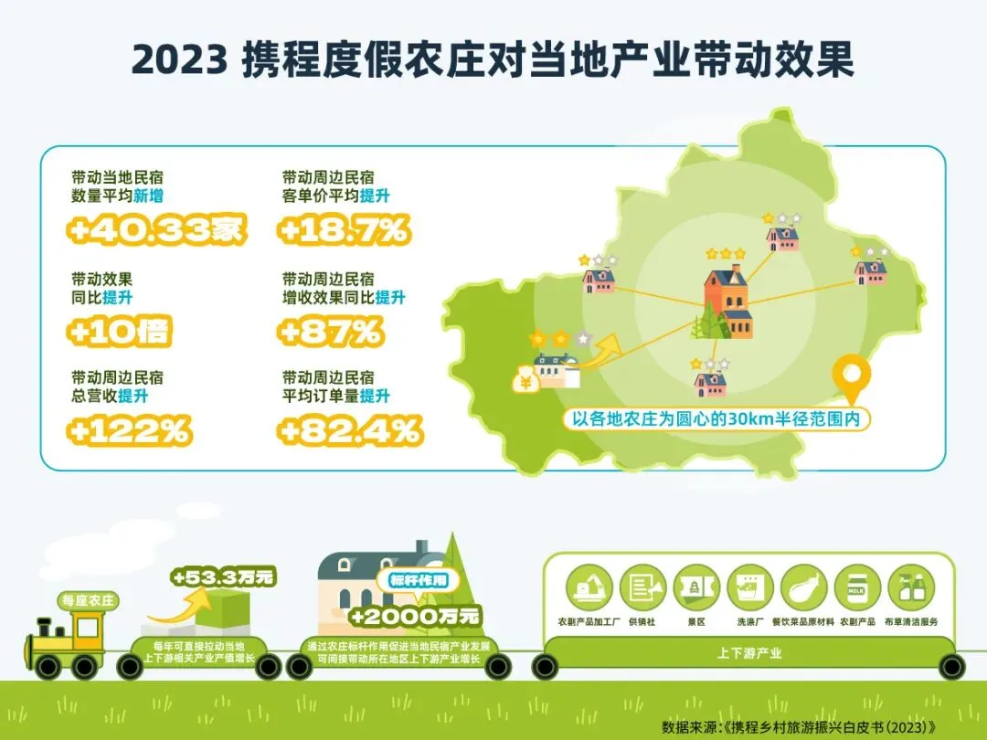 数据显示,2023年1月-10月,以各地农庄为圆心30km半径范围内,每家农庄平均带动当地新增民宿40.33家,带动周边民宿平均订单量提升82.4%,带动周边民宿客单价平均提升18.7%,农庄的民宿标杆作用效果显著。而民宿行业繁荣,也带动了上下游相关产业的兴盛。根据测算,平均每家携程农庄落成,每年可直接拉动当地上下游相关产业产值增长约53.3万元。而通过促进当地民宿数量新增和产业发展,农庄间接带动所在地区上下游产业增长约2000万元。