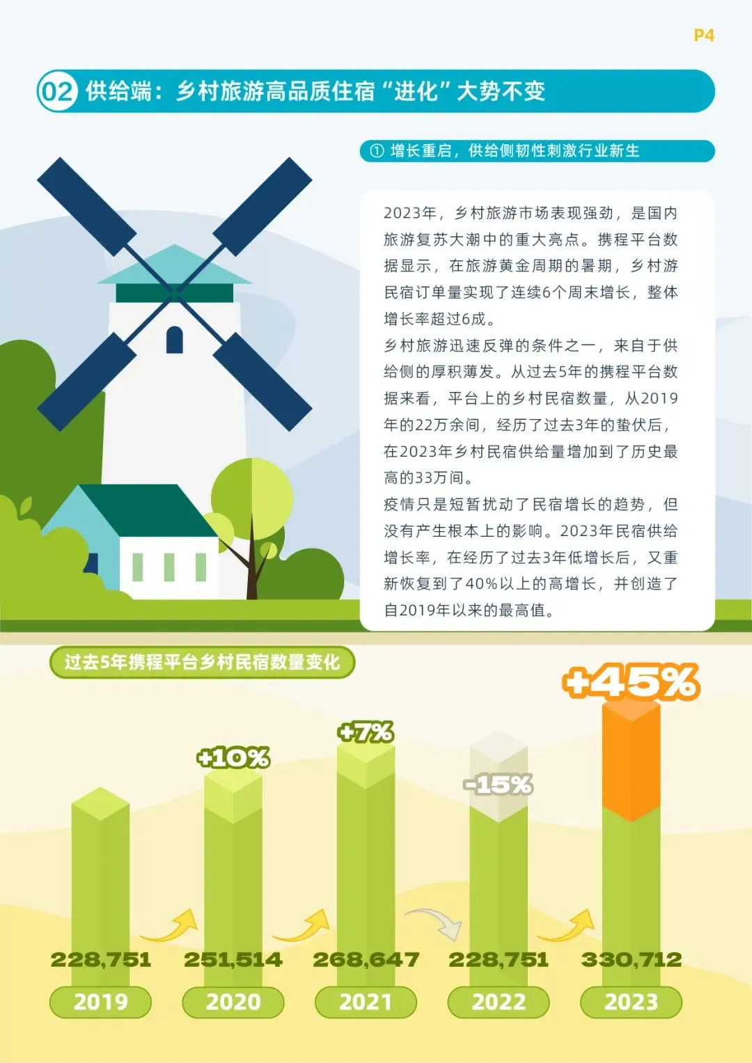 而民宿数量变化是市场对乡村旅游与未来预期的最好体现,根据白皮书显示,经历3年蛰伏,2023年携程平台乡村民宿供给量创造了5年以来最高的44%增长,总量达到历史峰值33万家。