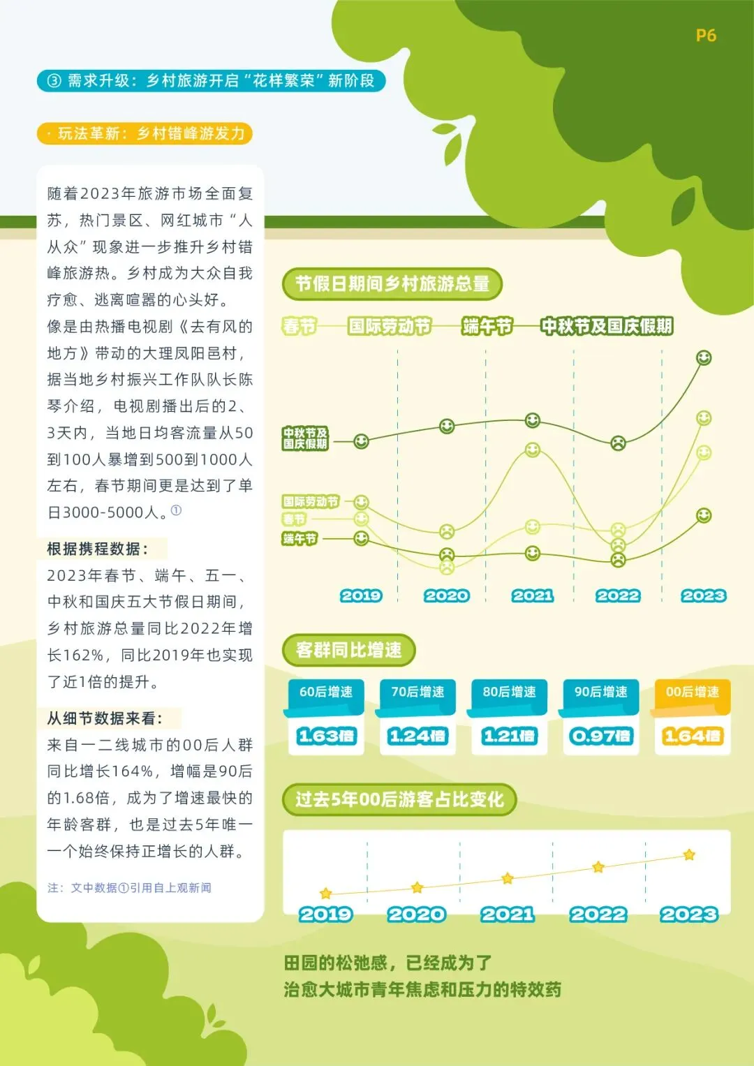 白皮书内容显示,2023年乡村旅游人群中,来自一二线城市00后人群同比增长164%,成为了增速最快客群。田园的松弛感,成了治愈大城市青年焦虑和压力的特效药。