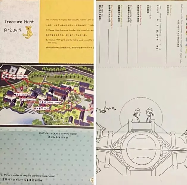 特别要说的是,这一次西子湖四季还特别推出“仲夏夺宝奇兵”亲子活动。在大堂Check in的时候,就会收到一份精心设计的儿童四季夺宝图(背面是西湖特色的填色图案),小朋友根据地图去酒店相关地点盖满印章就可参与转盘抽奖,收获小礼物。这么美这么大的酒店,想集满印章也不是容易的事哦,这对小朋友来说真是既充满惊喜,又增加乐趣!