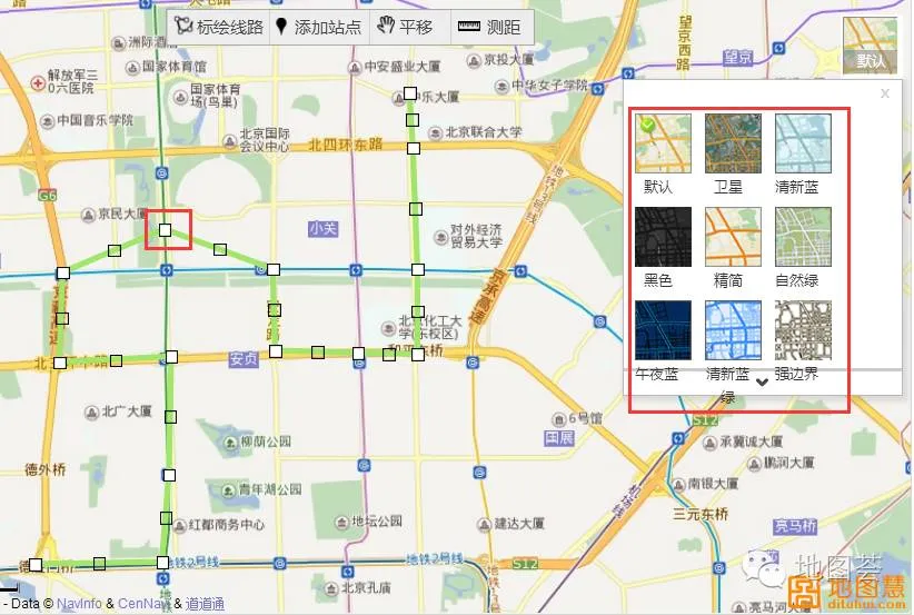 5、在编辑状态下点击线路节点可调整线路,点击地图右上角默认地图可更改地图底色。