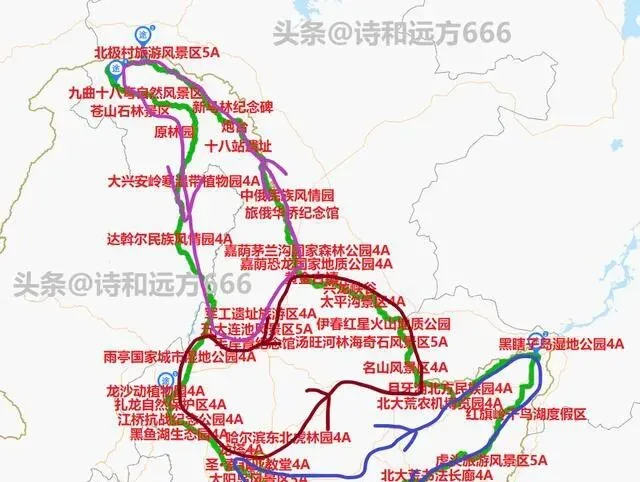 图中每种颜色代表一个黑龙江自驾游小环线,我认为这三条黑龙江小环线自驾游线路还是非常不错的,小环游线里黑龙江中部没有的景点我就不列出来了,自驾之前朋友们要做好功课,可以根据爱好或来源地就近选择小环游路线。