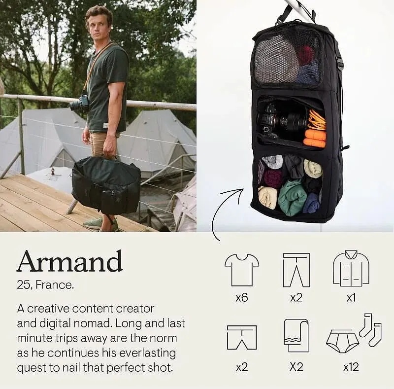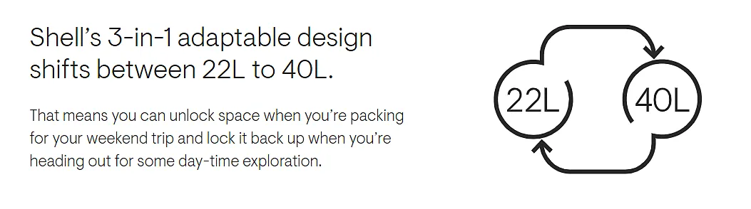 贝壳天生就是用途最广的背包,适合最活跃人群的需求。其颠覆性的设计,改善了用户体验,并节省了20%的空间感谢室内壁橱。可调节至22L、30L和40L三种尺寸,具有符合人体工程学的后面板和双通道气流,最大限度地提高舒适性和透气性,可拆卸配件,采用防水材料和可回收材料制成。