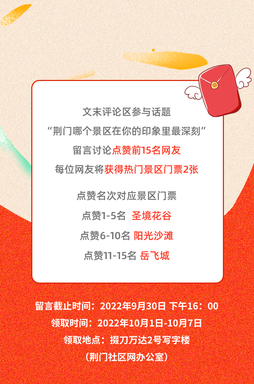 “荆门社区网”微信公众号9月27日、28日发布旅游景点推介文章,网友参加文末指定话题留言讨论,留言点赞靠前的网友获取热门景区门票2张,获奖网友凭文章留言中奖回复领取。