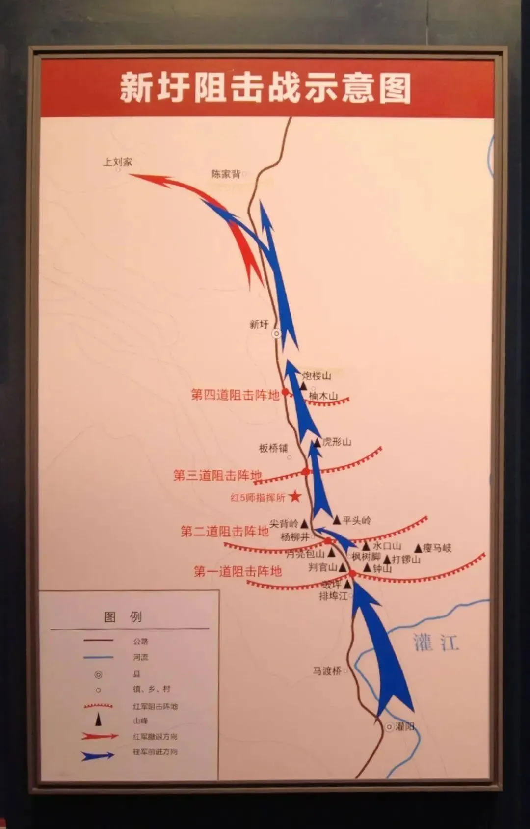新圩位于桂北交通要道——灌全公路之上,红三军团红五师及军委炮兵营3900名将士扼守在新圩一线,迎战桂军七个团约15000多人的疯狂进攻。红五师以寡敌众,全军将士在新圩至枫树脚一带建立四道阻击线,层层抵抗,在沿公路约10公里之内,利用地形占据路旁每一座小山,设置阻击阵地。