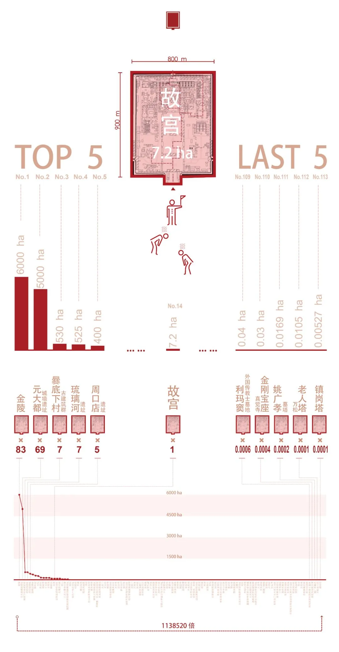 故宫是绝大部分来北京的游客必参观的景点,我们以故宫的尺度为一个劳累标准,横向对比其他国保单位的面积得到走断腿指数(除去部分无法统计的国保单位)。可以看出金陵与元大都城墙遗址以极大面积在排名中拉开剩下的国保单位成为最走断腿指数的状元及榜眼,故宫排名第14名,在整个国保区间中尺度排名很前面的单位。而最小尺度的国保单位是镇岗塔,面积是金陵的一百万分之一。