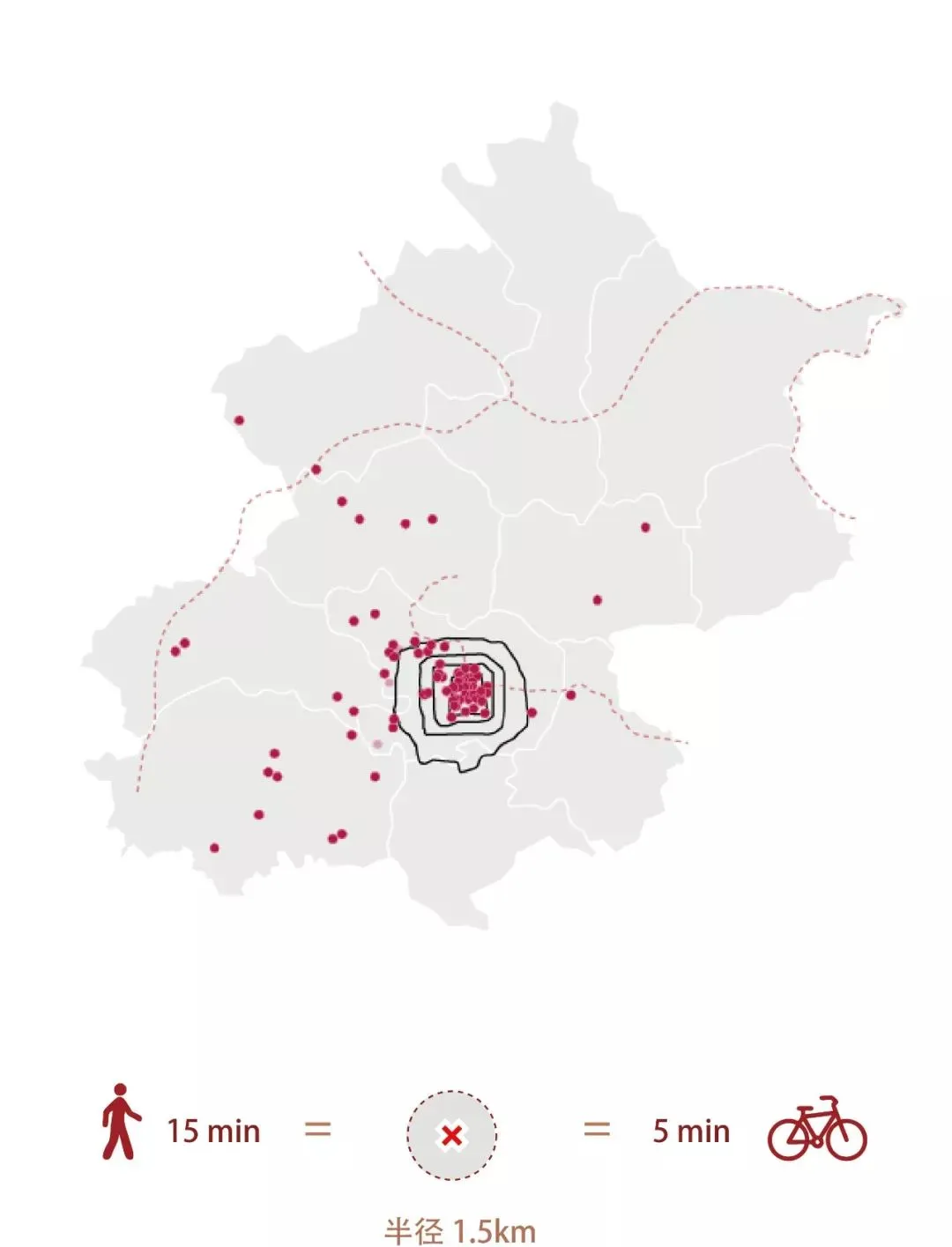 北京是一个以故宫为中心向外摊开环线规划的城市。所以我们以故宫为圆心画圆,每10km为一个单位定位各区的大概位置。越接近圆心的区域越容易到达,也就是更容易见到;反之,就是极难见的国保单位。