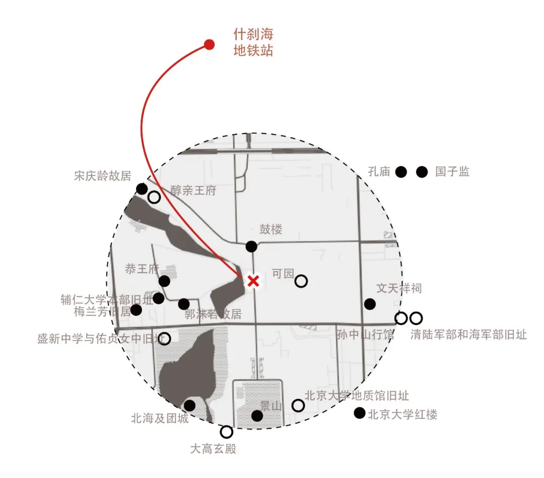第一个推荐站点:什刹海地铁站。半径1.5km内有13处国保单位,其中四处暂时未开放。片区内有大热的恭王府,后海酒吧街及南锣鼓巷片区等景点。外围临近景点还包括北大红楼,国子监,雍和宫等。