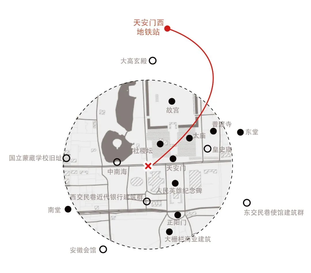 第二个推荐站点:天安门西地铁站。半径1.5km内有12处国保单位,其中四处暂时未开放。片区内有大热的天安门广场,故宫及前门大街片区等景点。外围临近景点还包括王府井商业街,西单等。