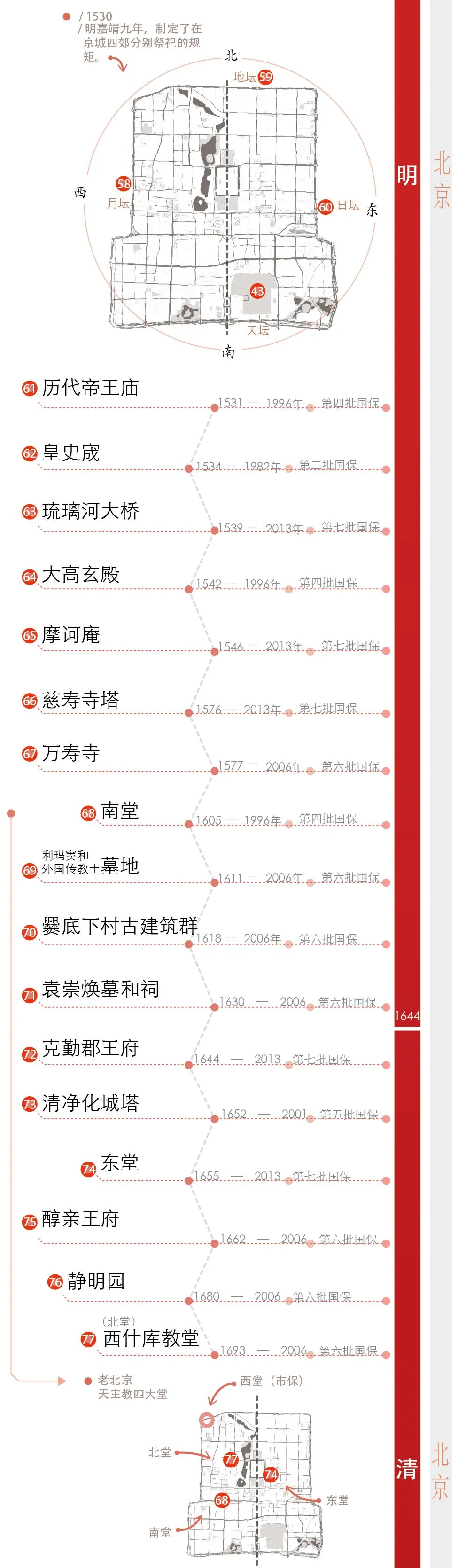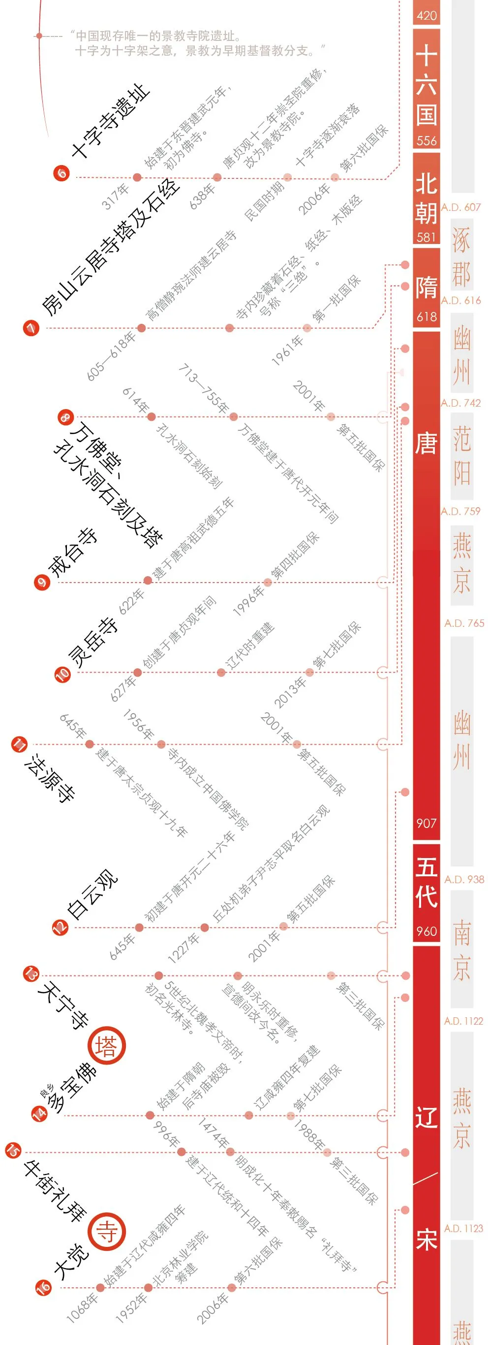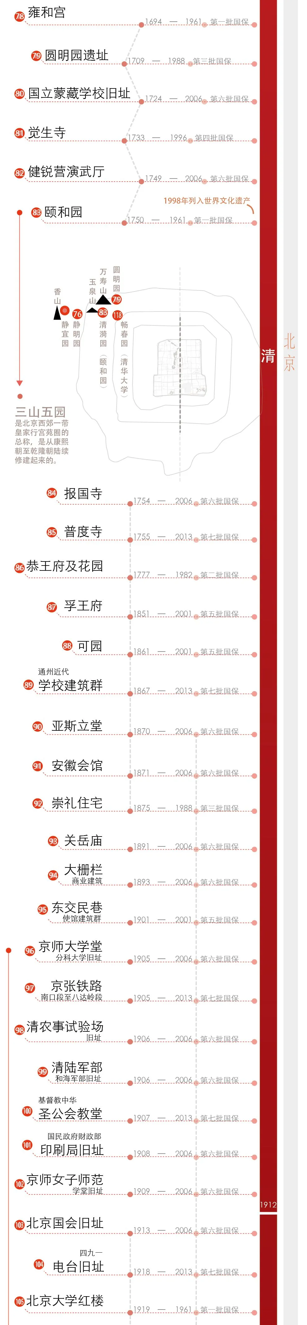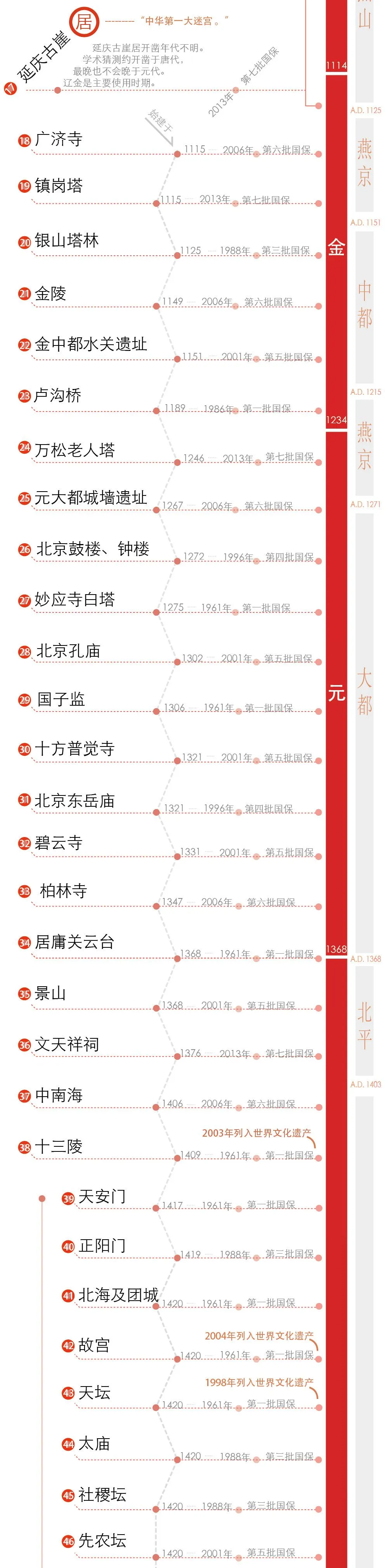 最后的最后,我们对帝都的126处国保(为分析方便,我们把各段长城合并为一个,综合总共有125项)按时间朝代进行了梳理 — 从70万年前的周口店遗址到1962年宋庆龄女士在周总理安排下住进西城区的四合院 —这个跨越万年的历程表即是北京深厚的文化历史见证,亦是每年千万游客到访帝都的动机。以信息图绘的方式展示,也是希望大众更好的了解我们的历史,我们从何而来,因为“ 我是谁?我从哪来?我要到哪去?”自古都是个值得深究的问题。