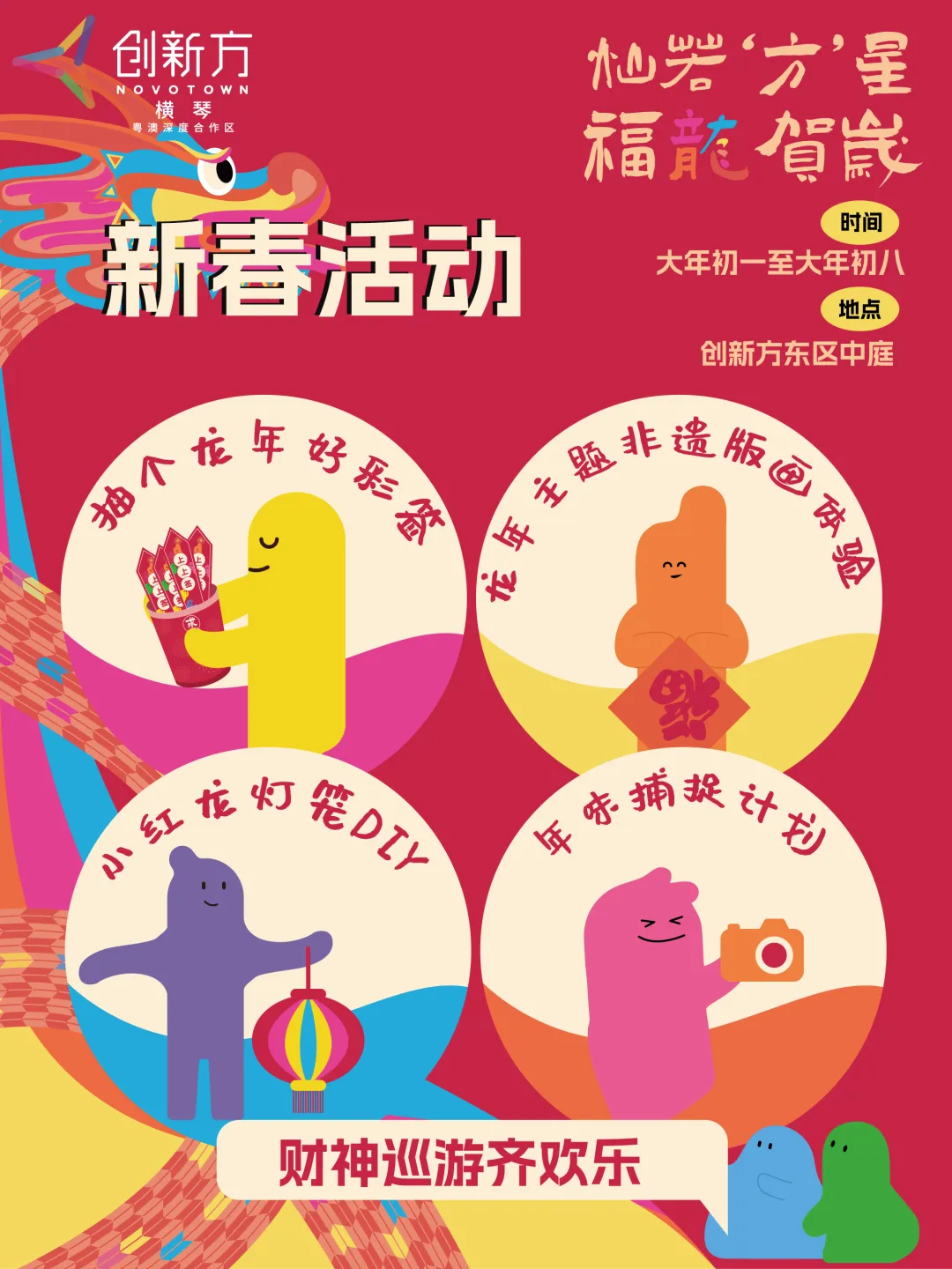 创新方“灿若方星,福龙贺岁”的主题中,特别策划了龙年好彩签、非遗版画、小红龙花灯、年味捕捉计划、迎财神等丰富的开年大戏,初一到初八,每天都精彩不停歇等候大家的到来哟~