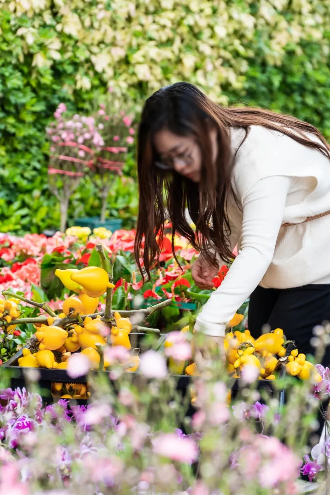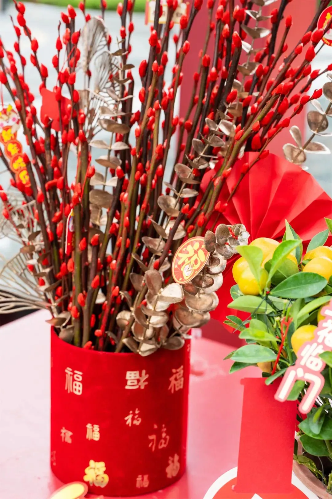 与“吉”同音的金桔,形似金元宝的黄金果,寓意“百年好合”的百合,还有小型的特色花卉,桃花、五代同堂、水仙也争相绽放、争奇斗艳。