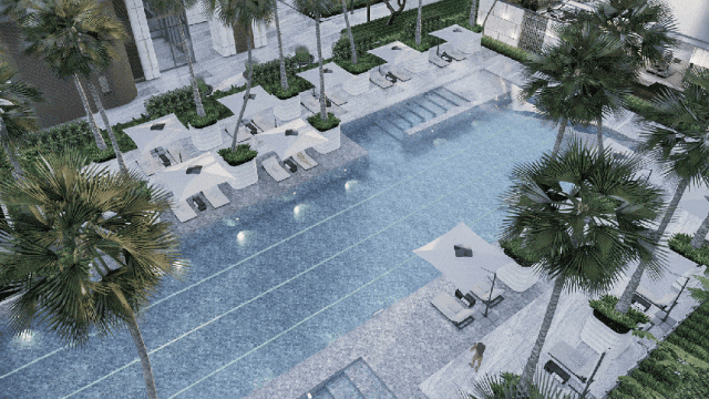 来自新加坡JTL的景观设计大师,在园林中融合迈阿密度假风情元素,打造林间庭院、水上乐园、健身庭院、品质会客厅等多个功能区。