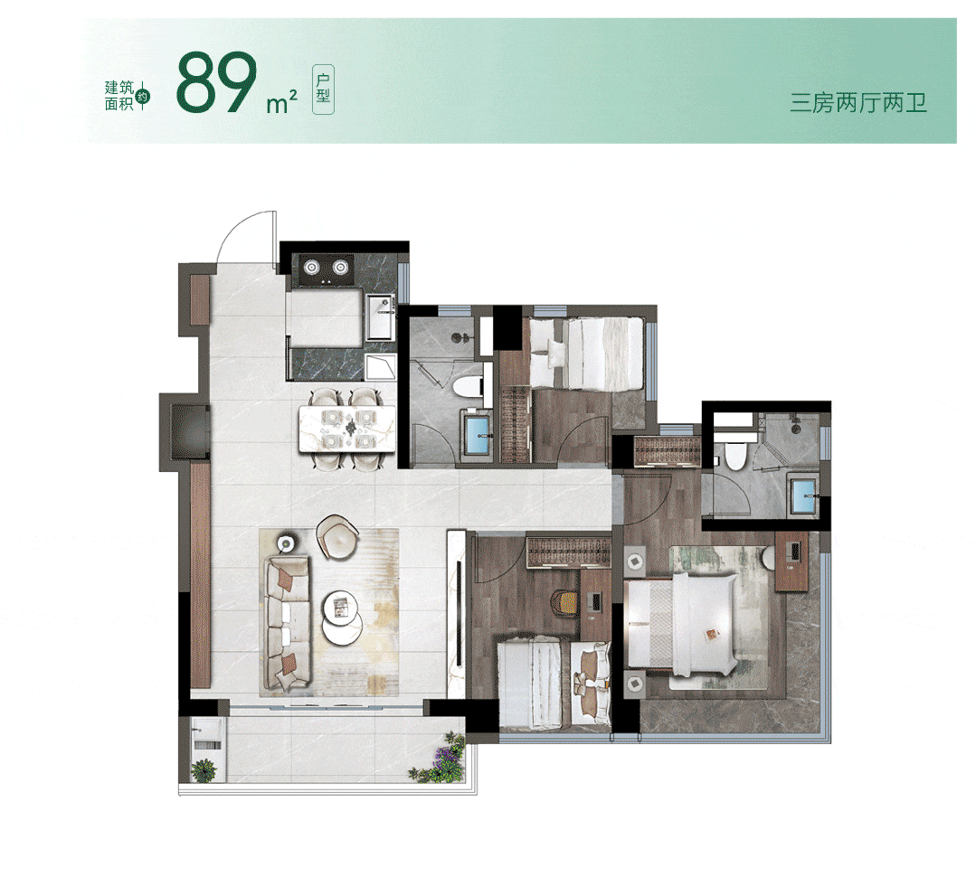 以不足90㎡的面积,做到三房两卫的配置,近100%实用率,带来约5.1米的客厅开间,是市面上120㎡以上户型才能达到的尺度。