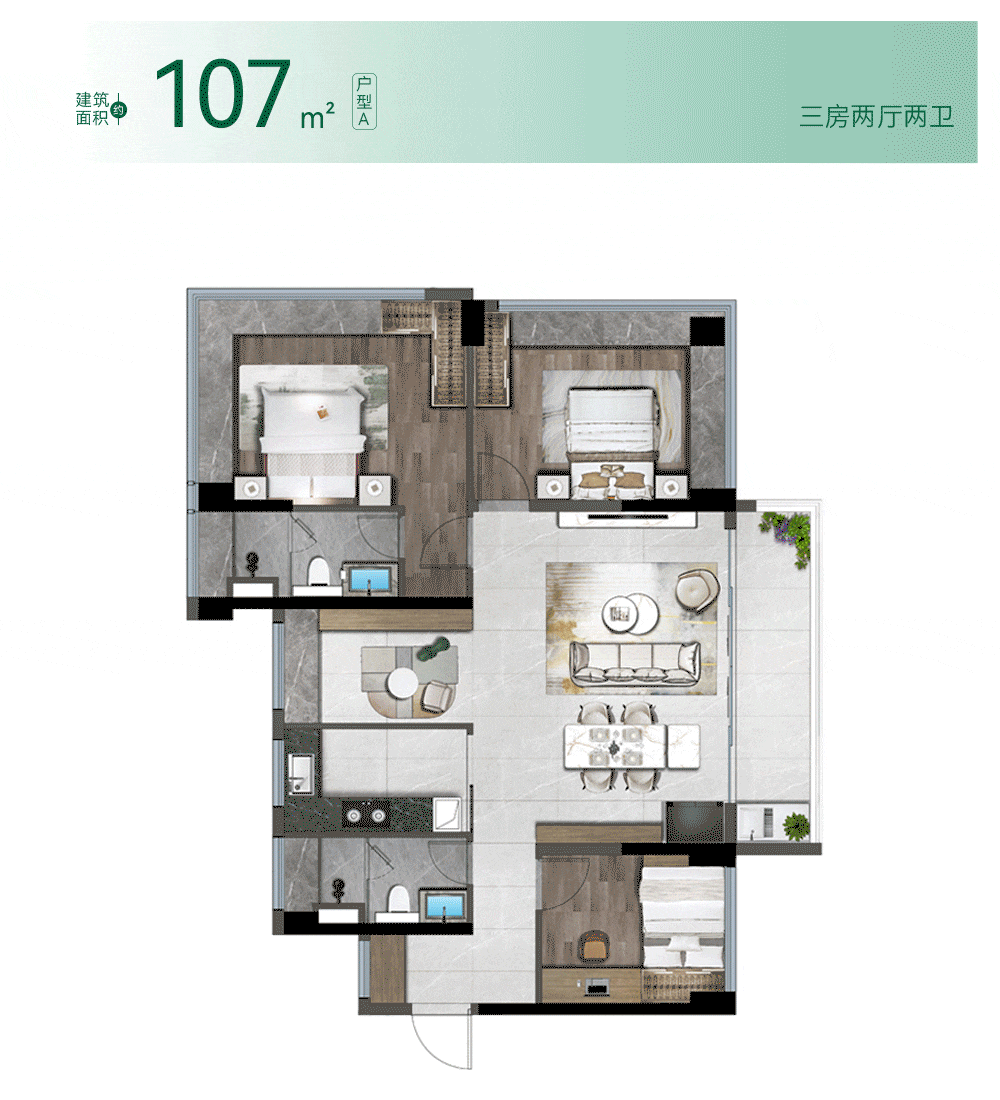 户型二:约107㎡三房两厅两卫