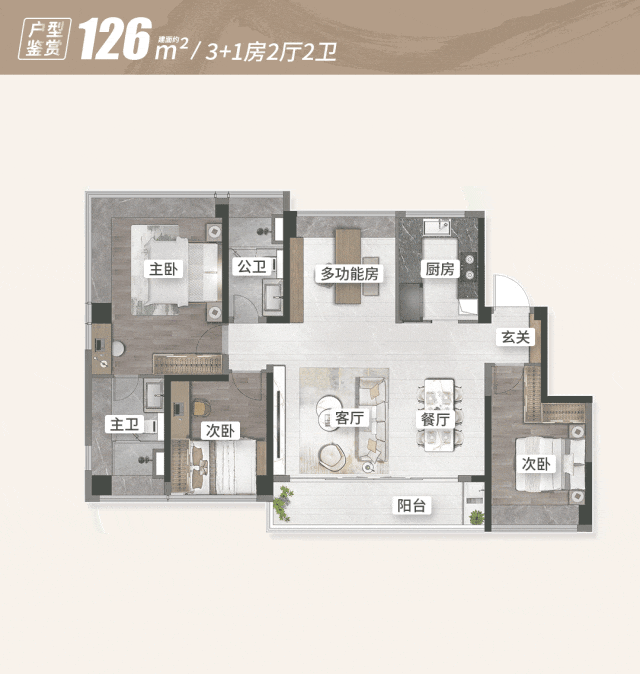 建面约126㎡户型,全明设计、南北对流。全屋有约19㎡的飘窗面积均为额外赠送,带来可观的实用率。
