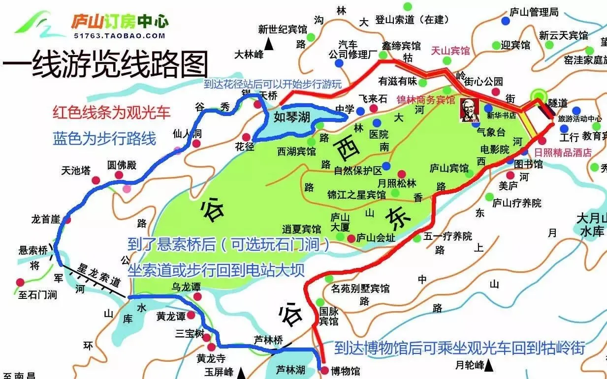 牯岭街——飞来石------(坐观光车的朋友也可以直接坐观光车到花径站)如琴湖——花径——锦绣谷——天桥——险峰——谈判台——仙人洞——御碑亭——龙首崖——悬索桥(也可以选游石门涧比较累)(石门涧可选票价64,索道上行回大坝30)——一般是坐星龙索道——电站大坝——乌龙潭——黄龙潭——三宝树——黄龙寺——芦林湖——庐山博物馆(坐车返回牯岭街)