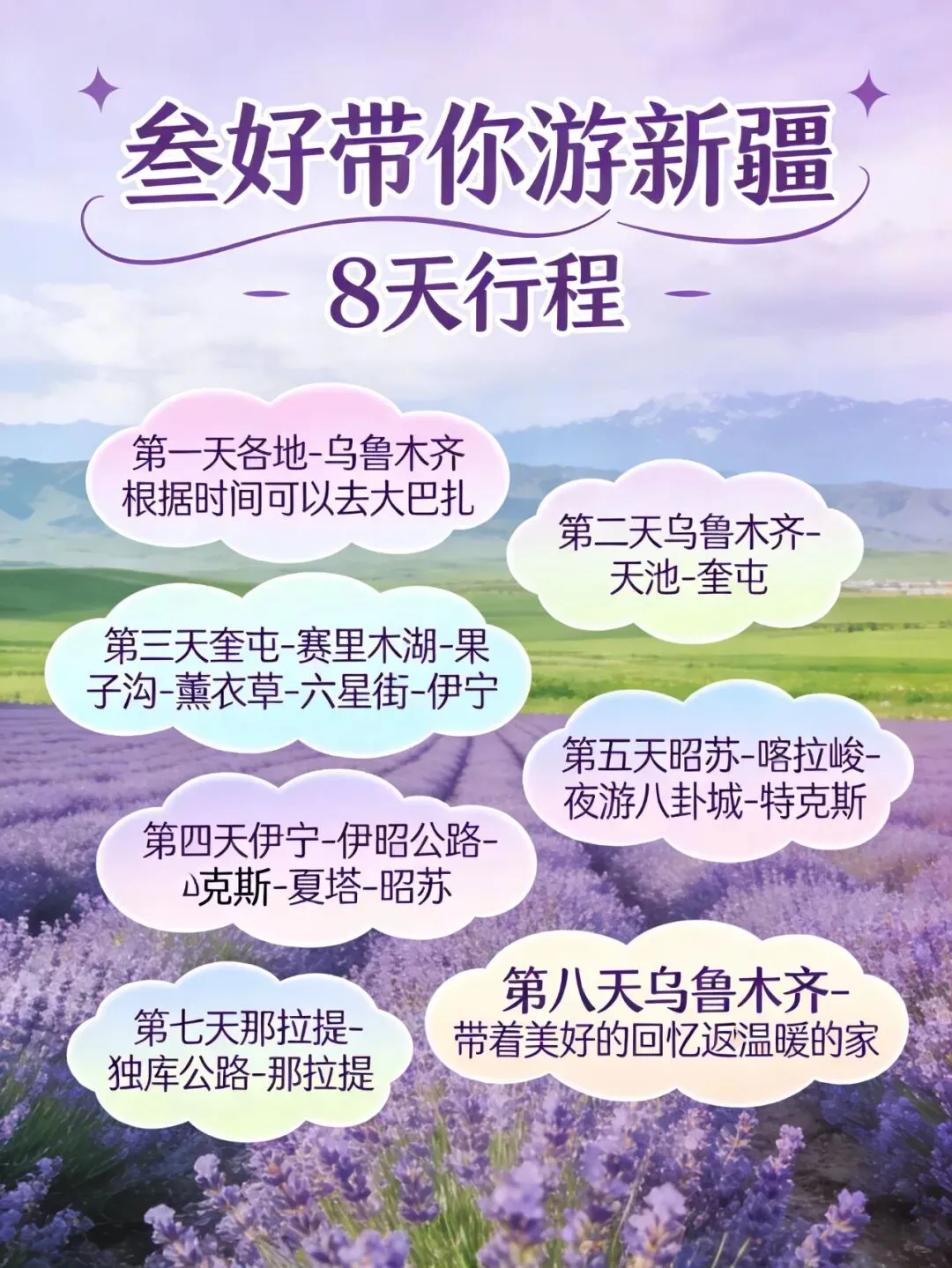 季节贴士:6-7月是伊犁最美的季节,薰衣草、油菜花、野花次第开放,但也是旺季,建议提前1个月预订住宿和车辆;9月秋景绝美,游客较少,性价比更高。