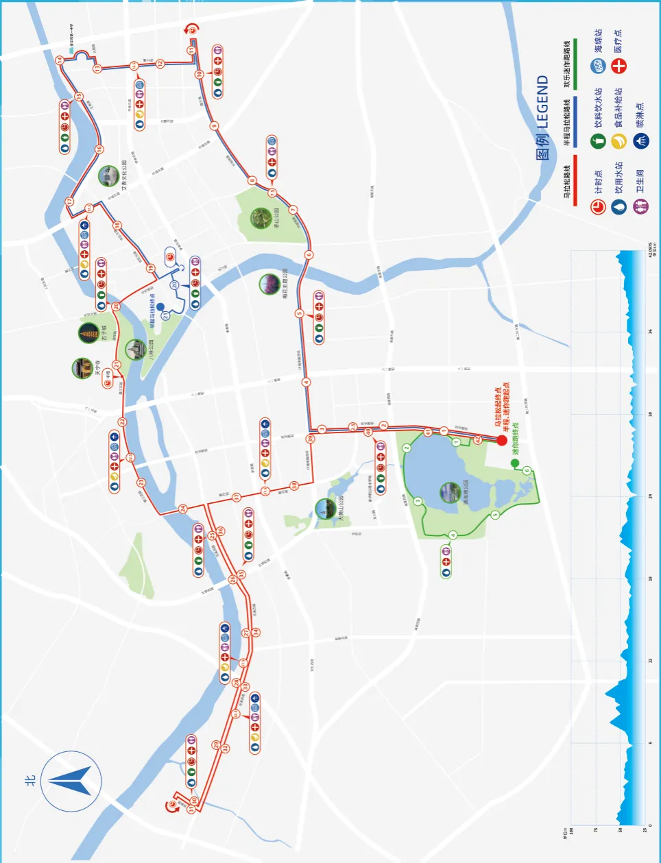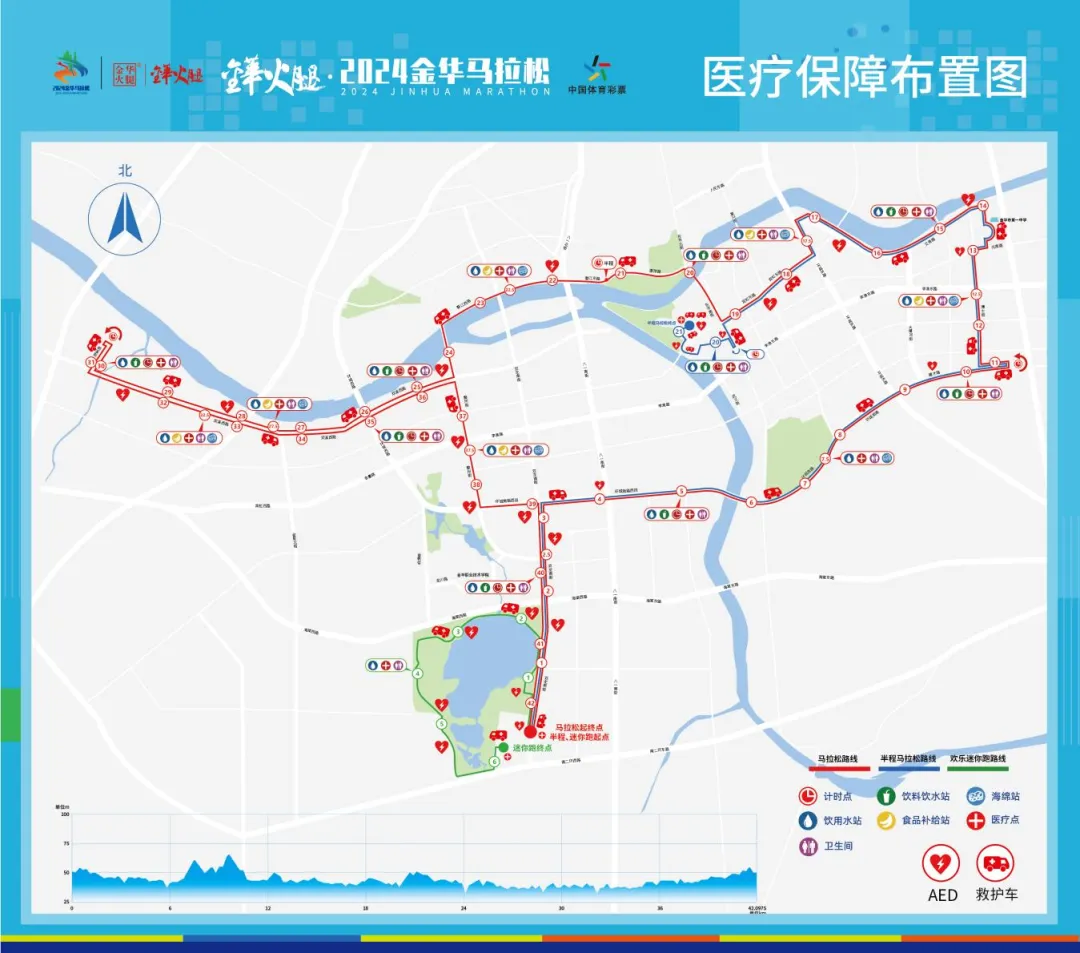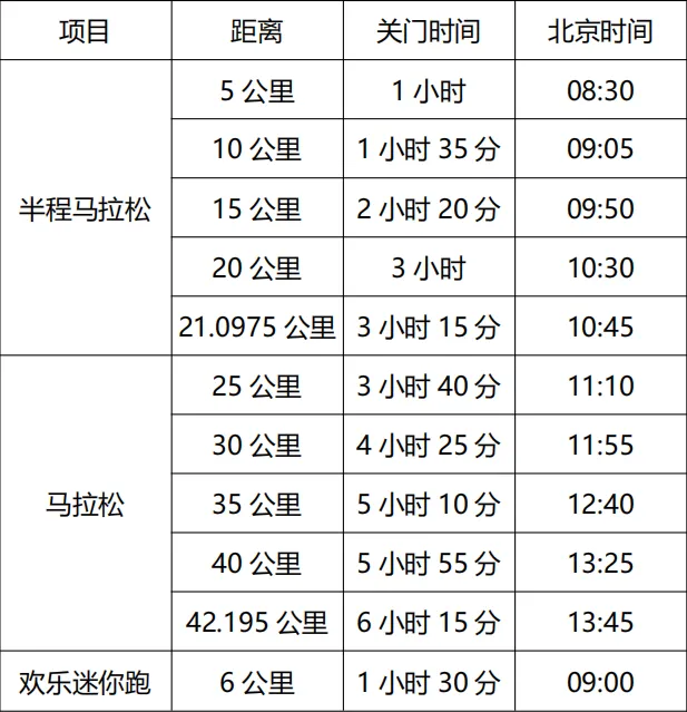 1.饮料站:5公里处、10公里处、15公里处、20公里处、25公里处、30公里处、35公里处、40公里处;