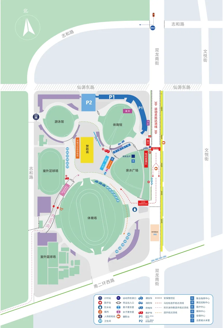 半程马拉松、欢乐迷你跑选手安检口设置在体育中心(南侧)南门进入体育中心通道处。