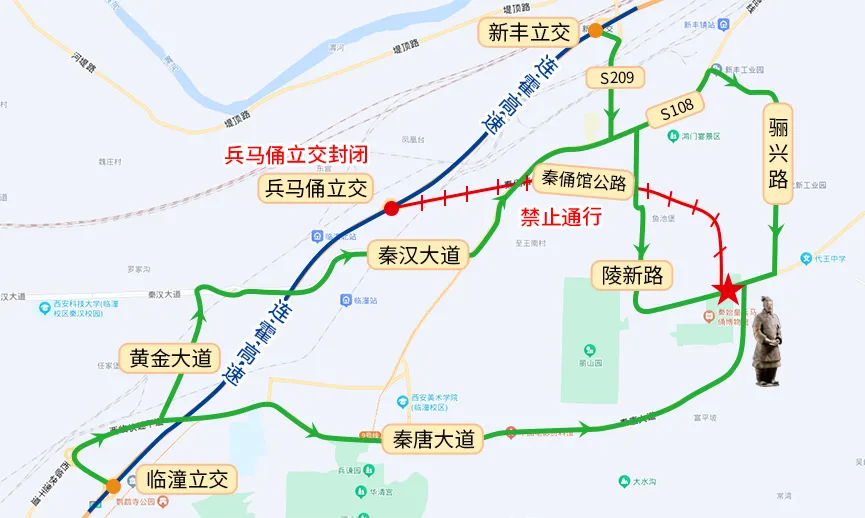 1.由于当前连霍高速(G30)兵马俑专用线公路正在实施改建工程,实行双向交通管制,禁止所有车辆通行,各位游客可由临潼或新丰收费站驶出,请提前了解路况规划路线。