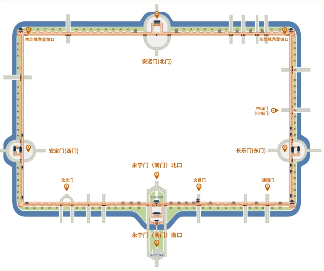 08:00-20:00:长乐门(东门)、安远门(北门)、西北城角登城口、东北城角登城口。