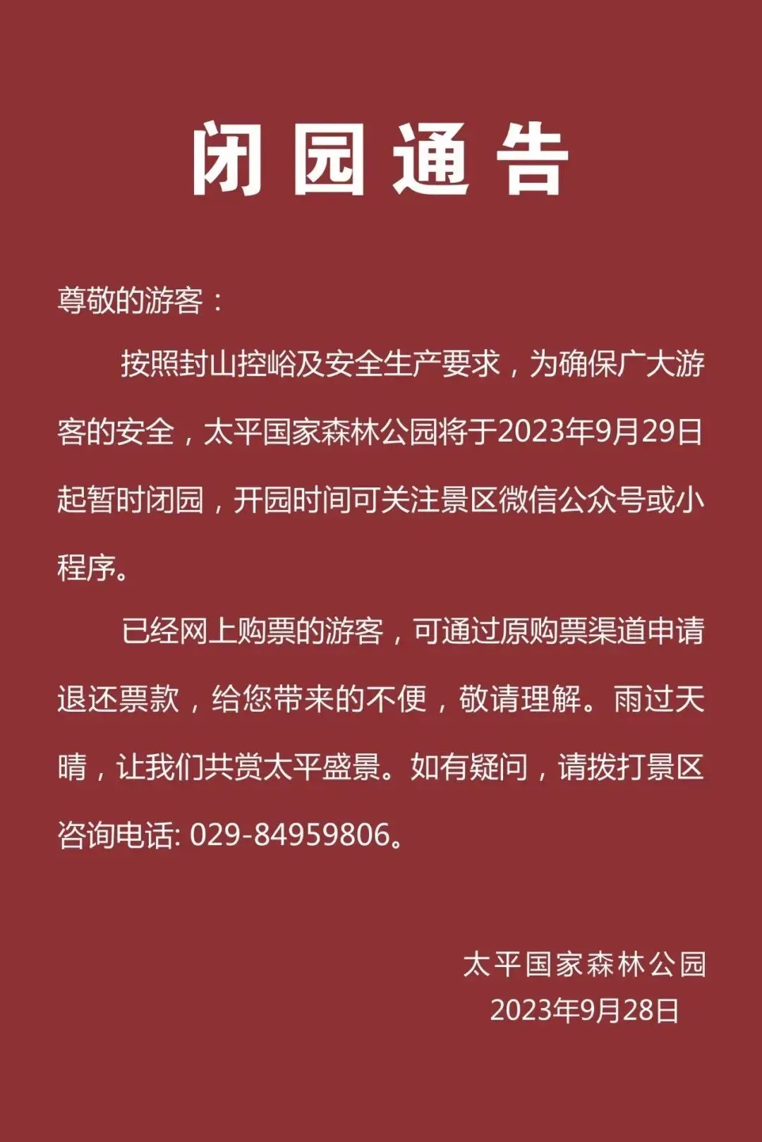 因天气原因,按照封山控峪相关要求,为确保广大游客安全,太平国家森林公园目前临时闭园中。开园时间请关注“太平国家森林公园”微信公众号或官网的公告信息。