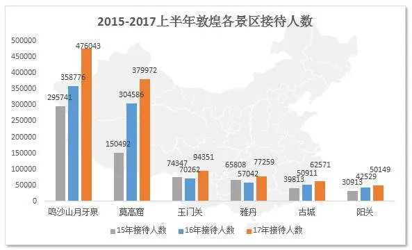 2017上半年,鸣沙山月牙泉景区接待人数47.6万人,同比增长32.69%;莫高窟接待人数38.00万人,同比增长24.75%;玉门关接待人数9.44万人,同比增长34.28%。雅丹接待人数7.73万人,同比增长35.44%;阳关接待人数5.01万人,同比增长17.92%;敦煌古城接待人数6.26万人,同比增长22.90%。