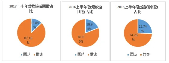 2017年上半年来敦旅游人群中,散客人数42.23万人,占比87.16%,团队人数6.22万人,占比12.84%,自2015到2017年敦煌旅游散客化趋势明显。