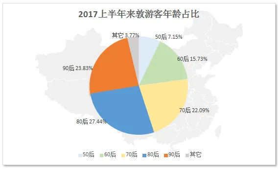 从2017年上半年来敦旅游人群年龄构成看,70后占比22.09%, 80后占比27.44%,90后占比23.83%,总计占来敦游客的73.36% 。