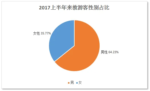 2017年上半年,来敦游客中,男性31.12万人,占64.23%,女性17.33万人,占35.77%,男性明显多于女性。“大漠孤烟直”、“长河落日圆”、“葡萄美酒夜光杯”对男性具有天然的吸引力,雅丹、玉门关探险之旅,戈壁沙漠的户外运动,使得敦煌成了男士的向往之地。