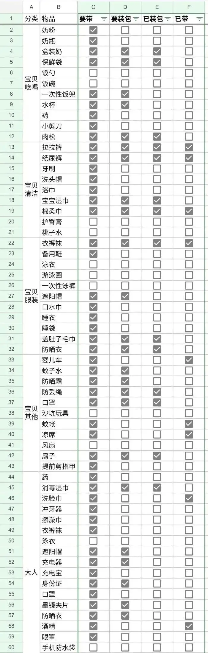 基于此,我特意制作了这份旅行必备清单,核心初衷便是为了规范梳理随行物品,尤其是针对宝贝的专属物品,做到不遗漏、不冗余(甚至连娃的尿不湿都考虑了哈哈哈~),兼顾实用性与便捷性。